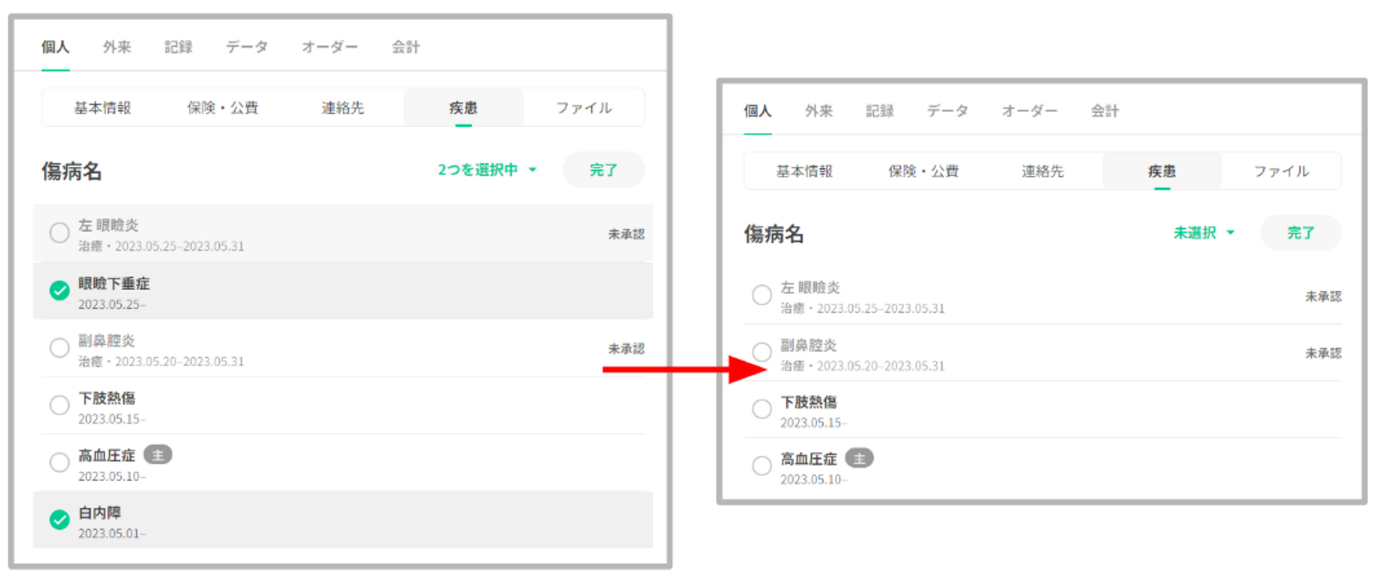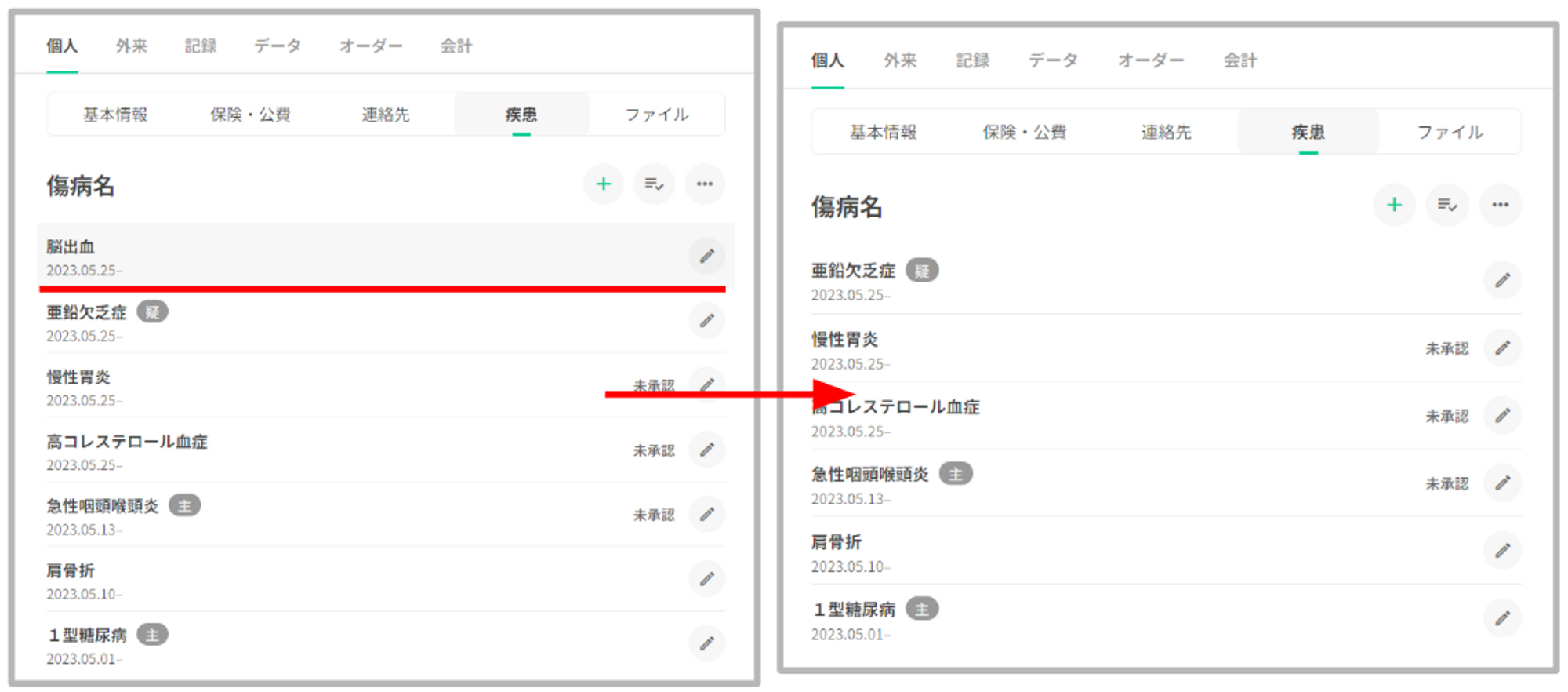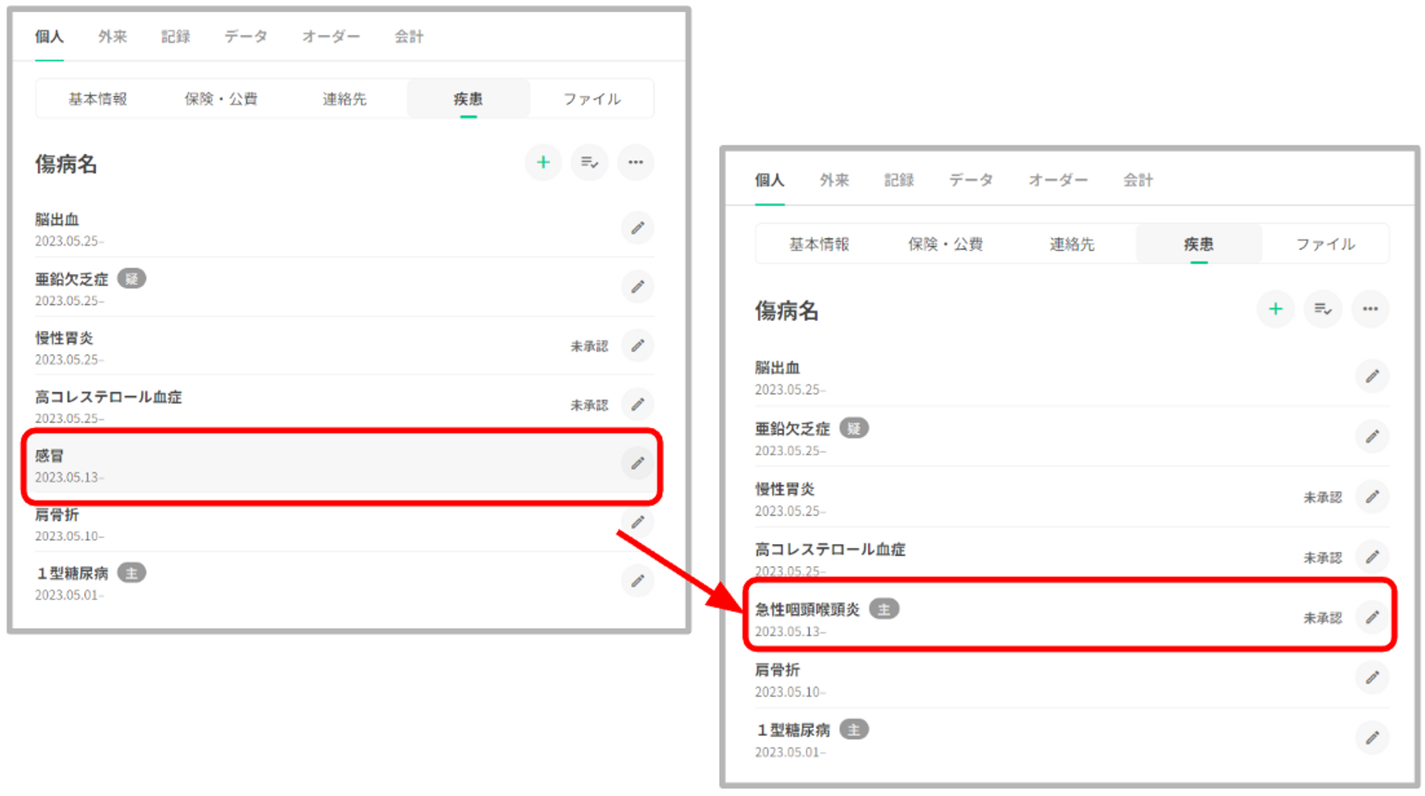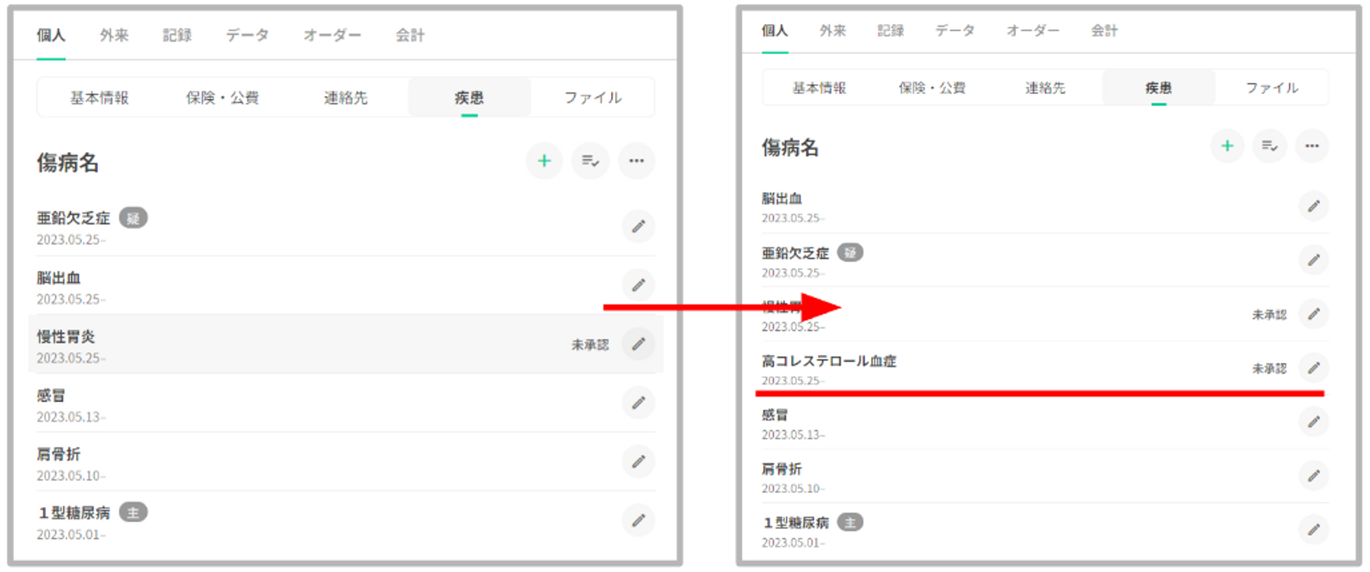 傷病名の編集画面でも未承認状態であることが確認できるようになりました。