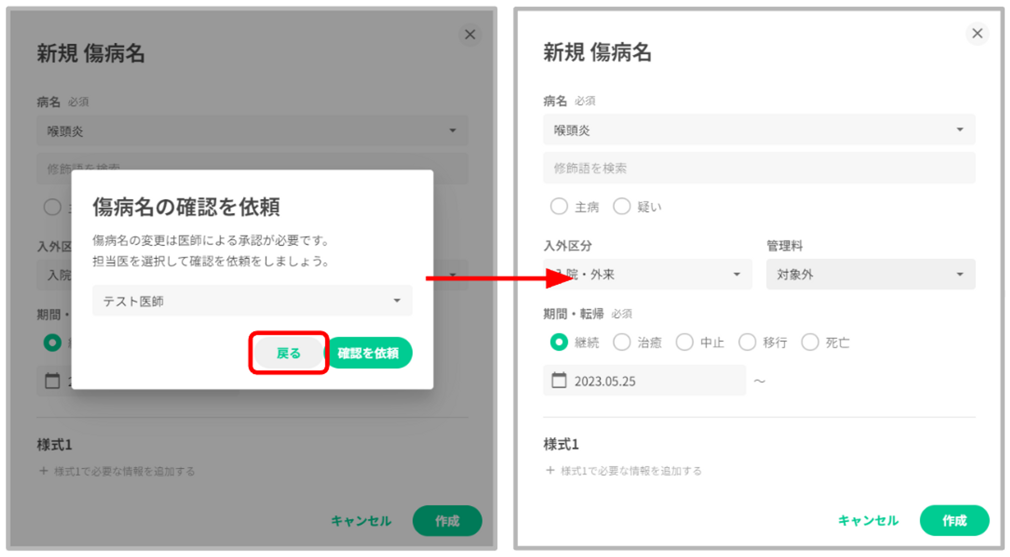「戻る」を押下すると、傷病名の編集画面へ戻ります。その際、直前まで編集していた内容は保持されたままになります。「確認を依頼」を押下しない限り傷病名の作成はできませんのでご留意ください。