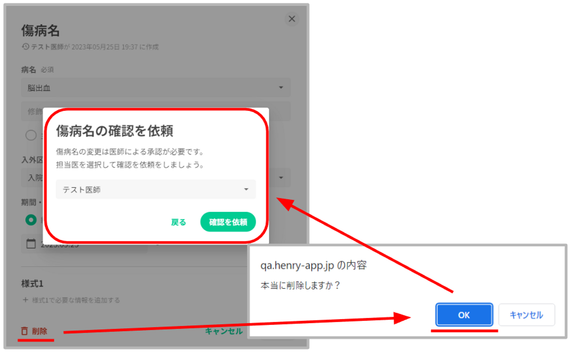 「削除」ボタンを押下し、確認メッセージをOKとすると「傷病名の確認を依頼」という確認依頼作成画面が表示されます。