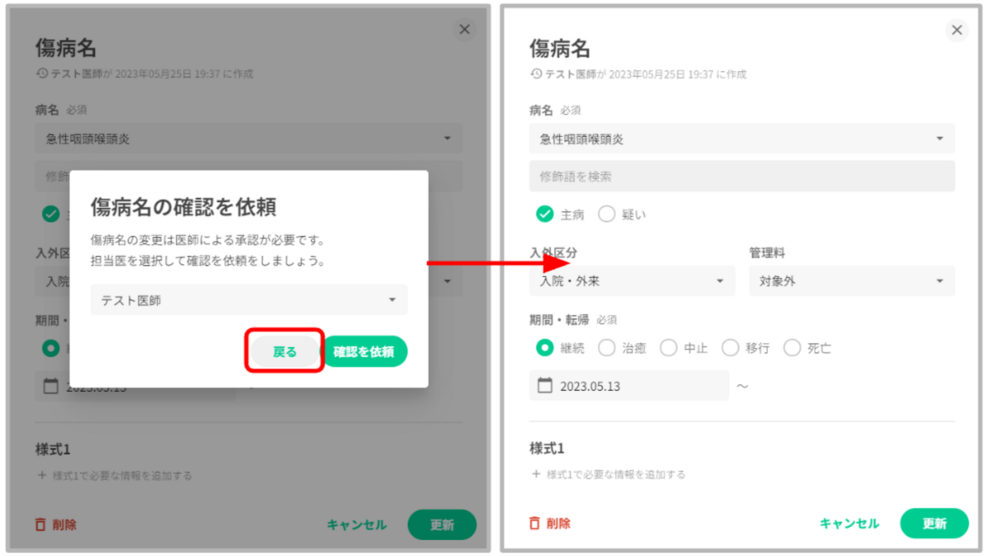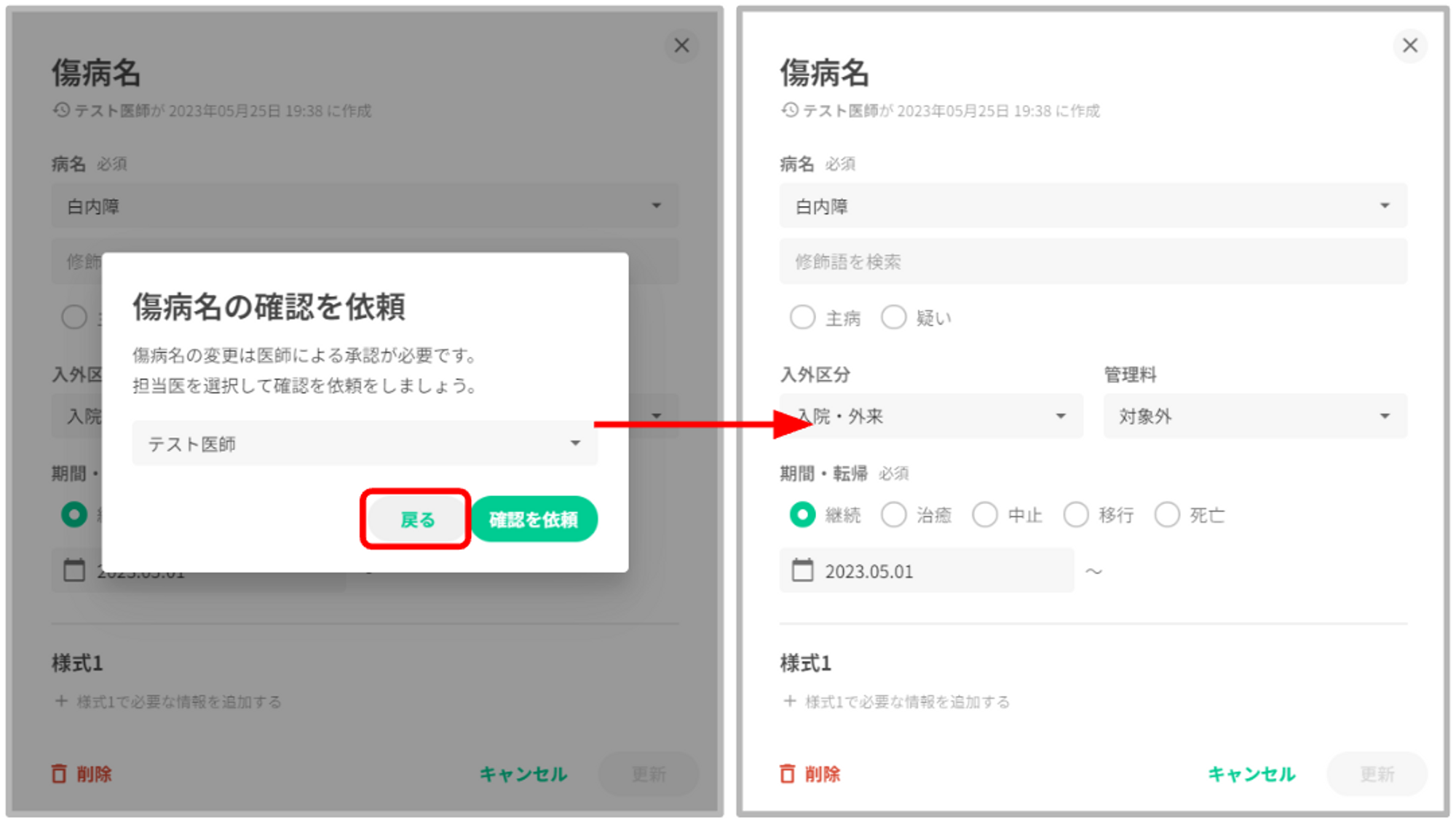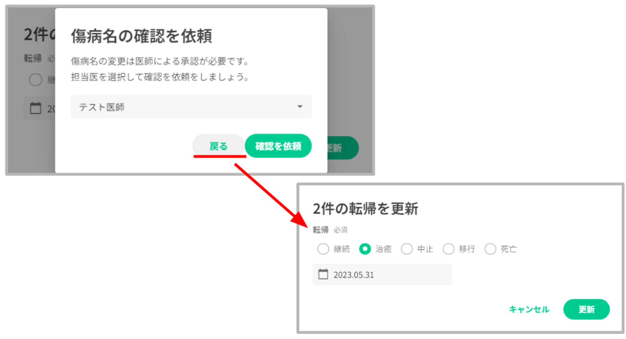 「戻る」を押下すると、転帰更新の編集画面へ戻ります。その際、直前まで編集していた内容は保持されたままになります。「確認を依頼」を押下しない限り傷病名の更新はできませんのでご留意ください。
