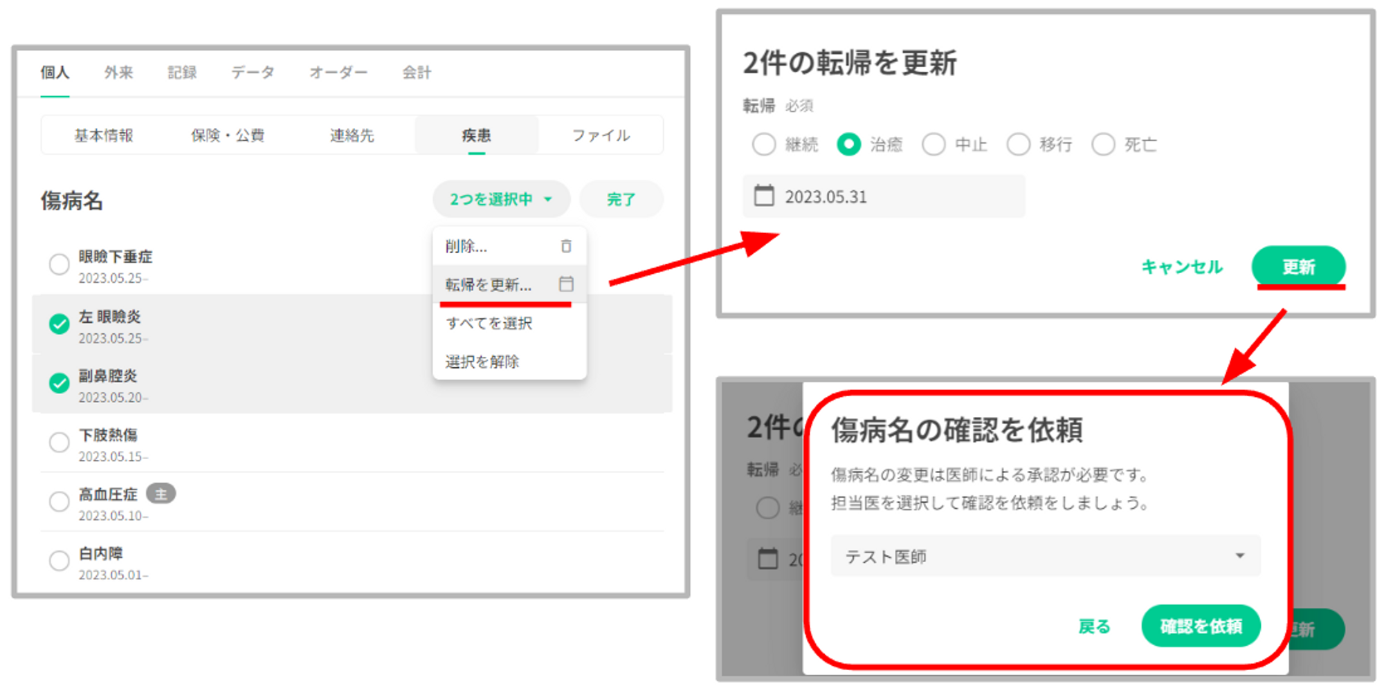 スタッフアカウントでの操作時に、傷病名の作成・更新・削除ボタンを押下すると「傷病名の確認を依頼」という確認依頼作成画面が表示され、確認依頼の作成ができるようになりました。また、一括編集モードの「転帰を更新」「削除」を押下した際も確認依頼作成画面が表示され、確認依頼の作成が可能です。