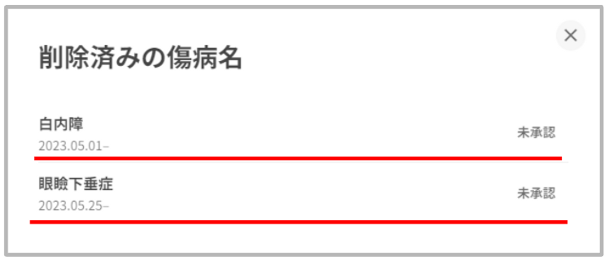 削除した傷病名は削除済の傷病名一覧に未承認状態で追加されます。
