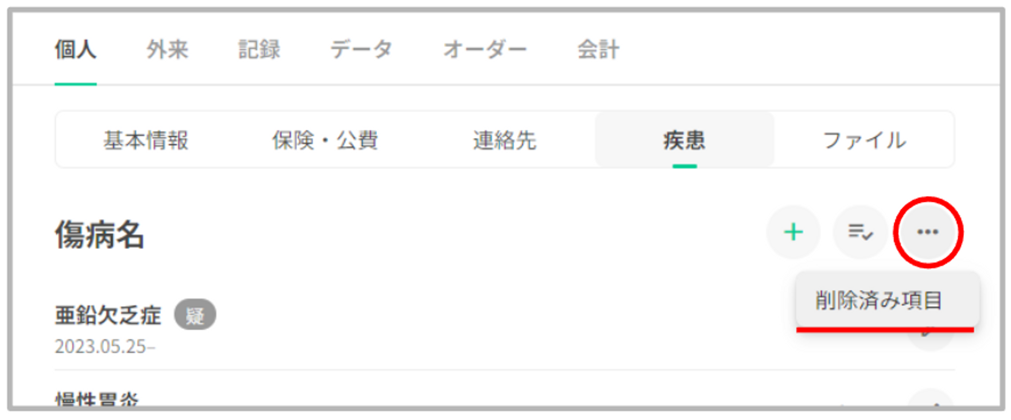 削除済の傷病名一覧は、今まで通り「…」の削除済み項目より確認することが可能です。
