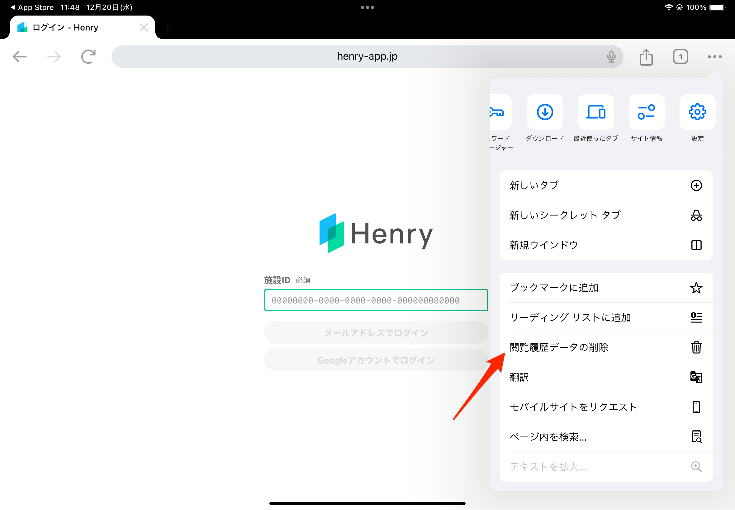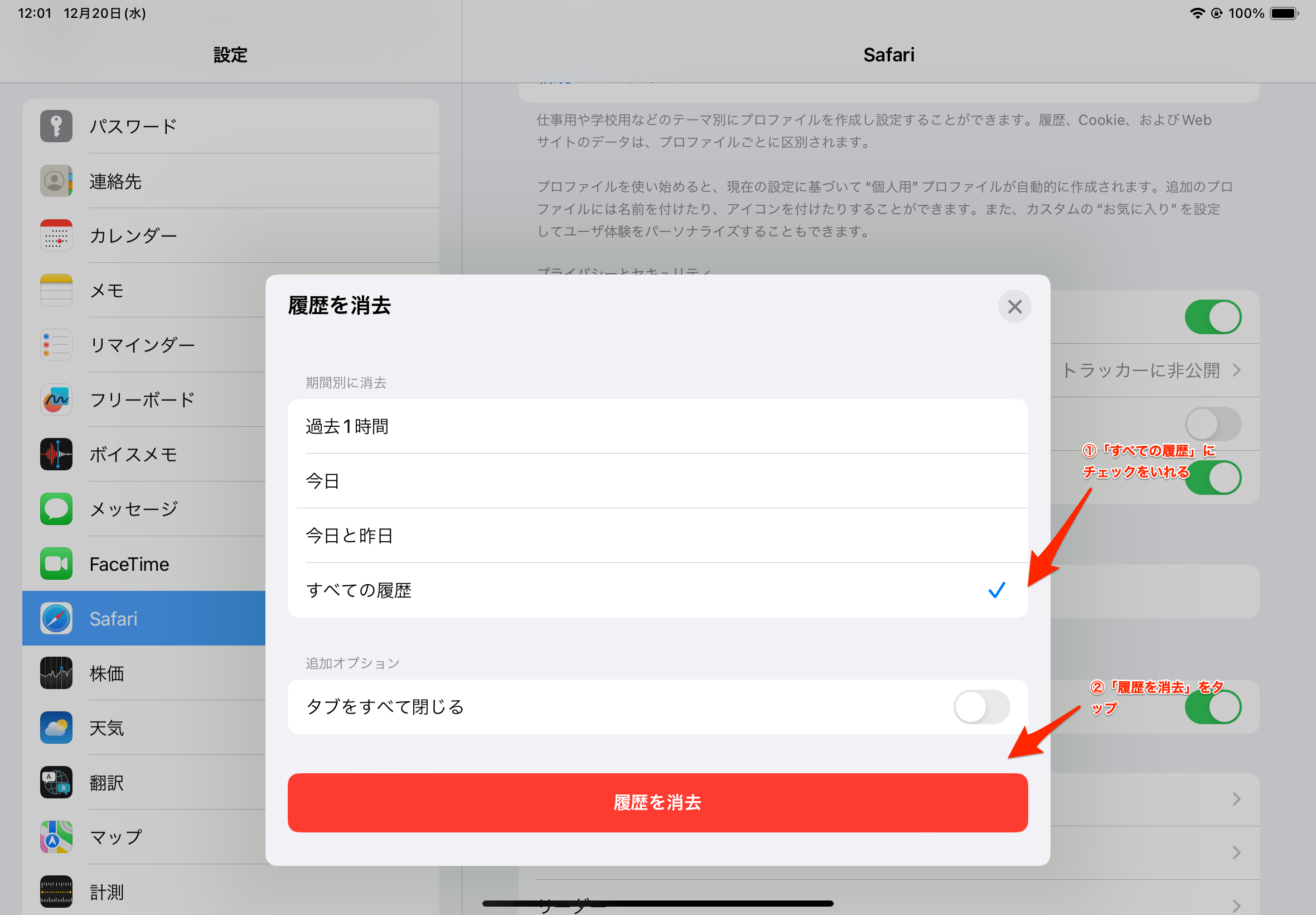 「すべての履歴」にチェックをいれ、「履歴を消去」をタップします。