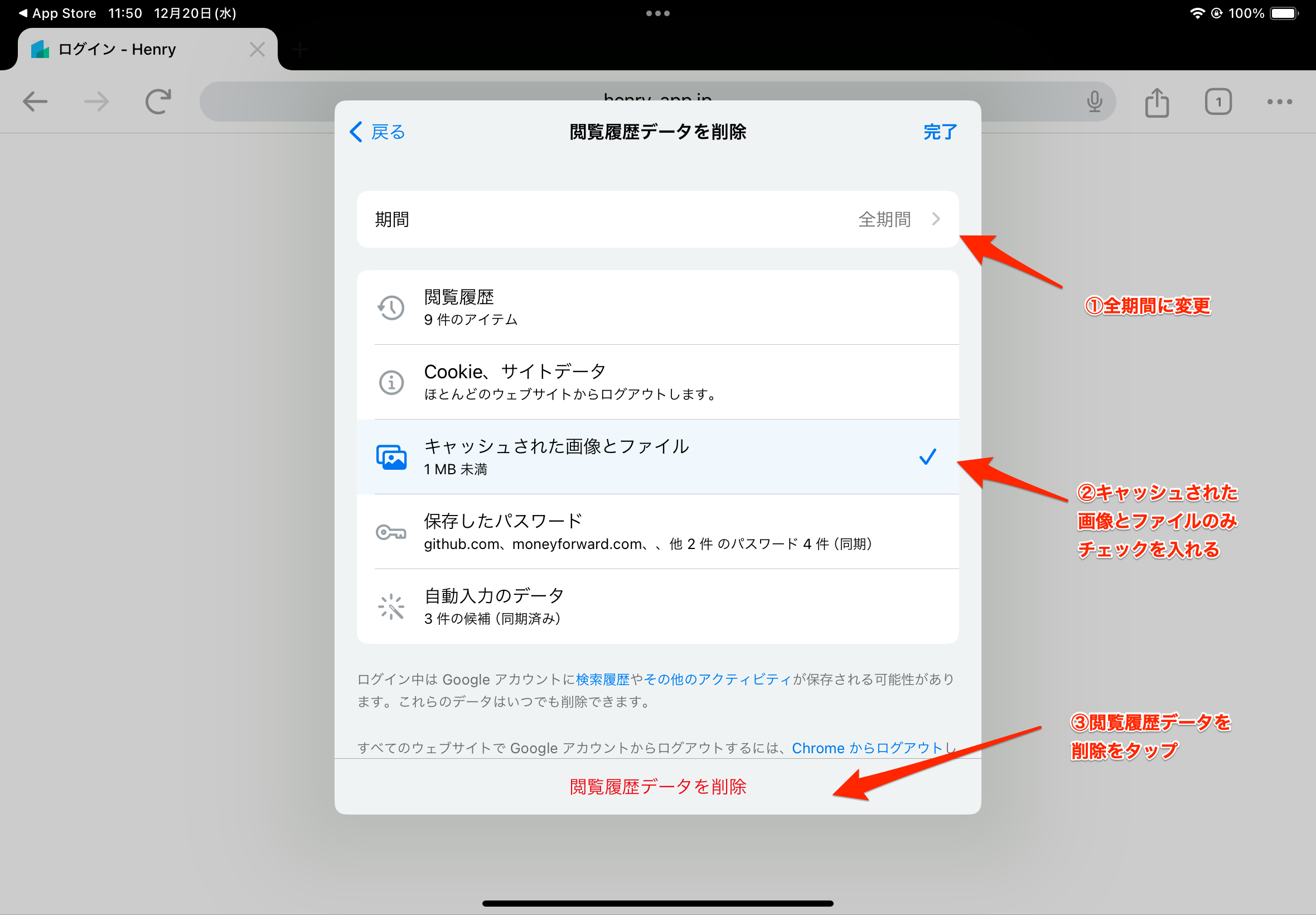 期間を「全期間」に変更(①)し、キャッシュされた画像とファイルのみにチェックを入れ(②)、「閲覧履歴データを削除」をタップします。(③)