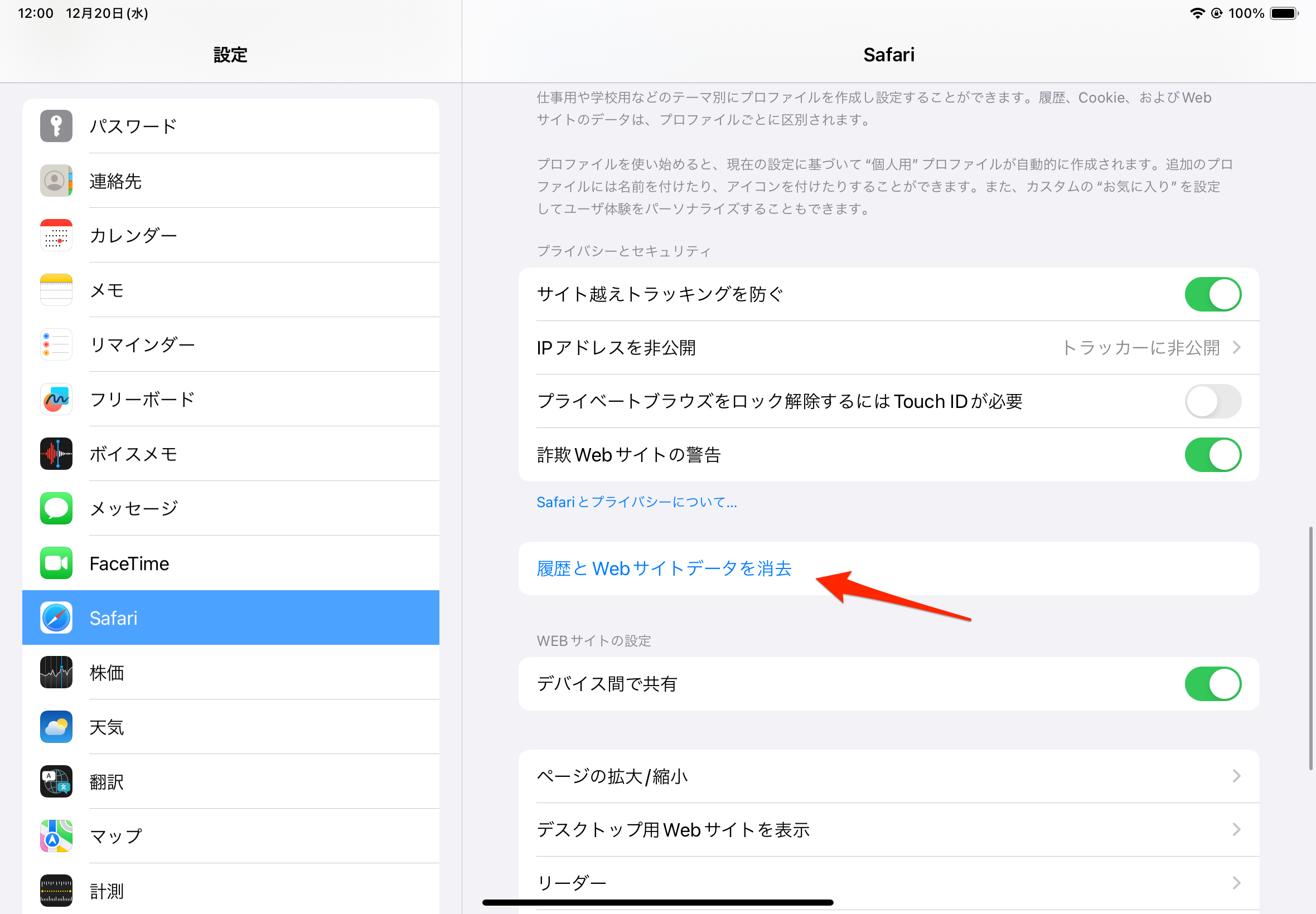 「設定」アプリを開き、Safariの設定から「履歴とWebサイトデータを消去」をタップします
