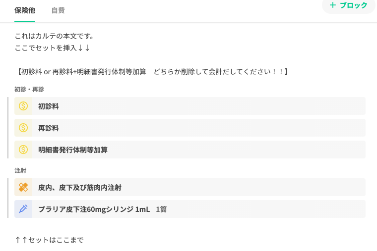 セットはカルテエディタにいくつでも挿入できますし、必要であれば挿入したセットの内容を改変することも可能です。