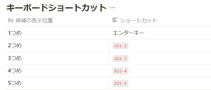セットの選択は、マウスクリックや矢印キー・エンターキーによっておこなえるほか、上位5つのセットは、候補の右側に記載されているキーボードショートカットでも選択することができます。