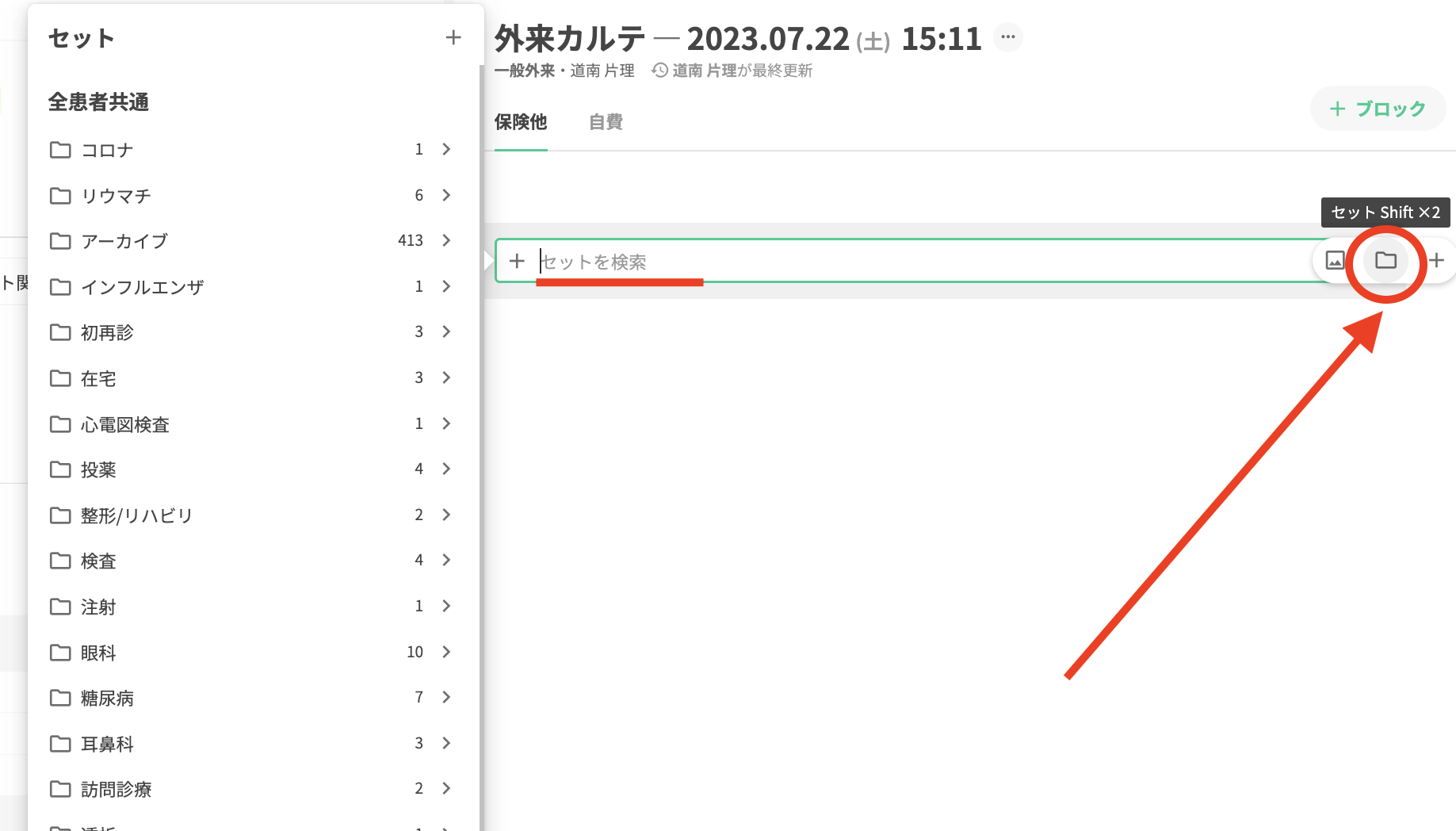 セットを挿入するには、まず、カルテ編集画面上の「フォルダ」ボタンをクリックし、セット選択ウィンドウを開きます。セット選択ウィンドウから該当のセットを選択するか、検索します。