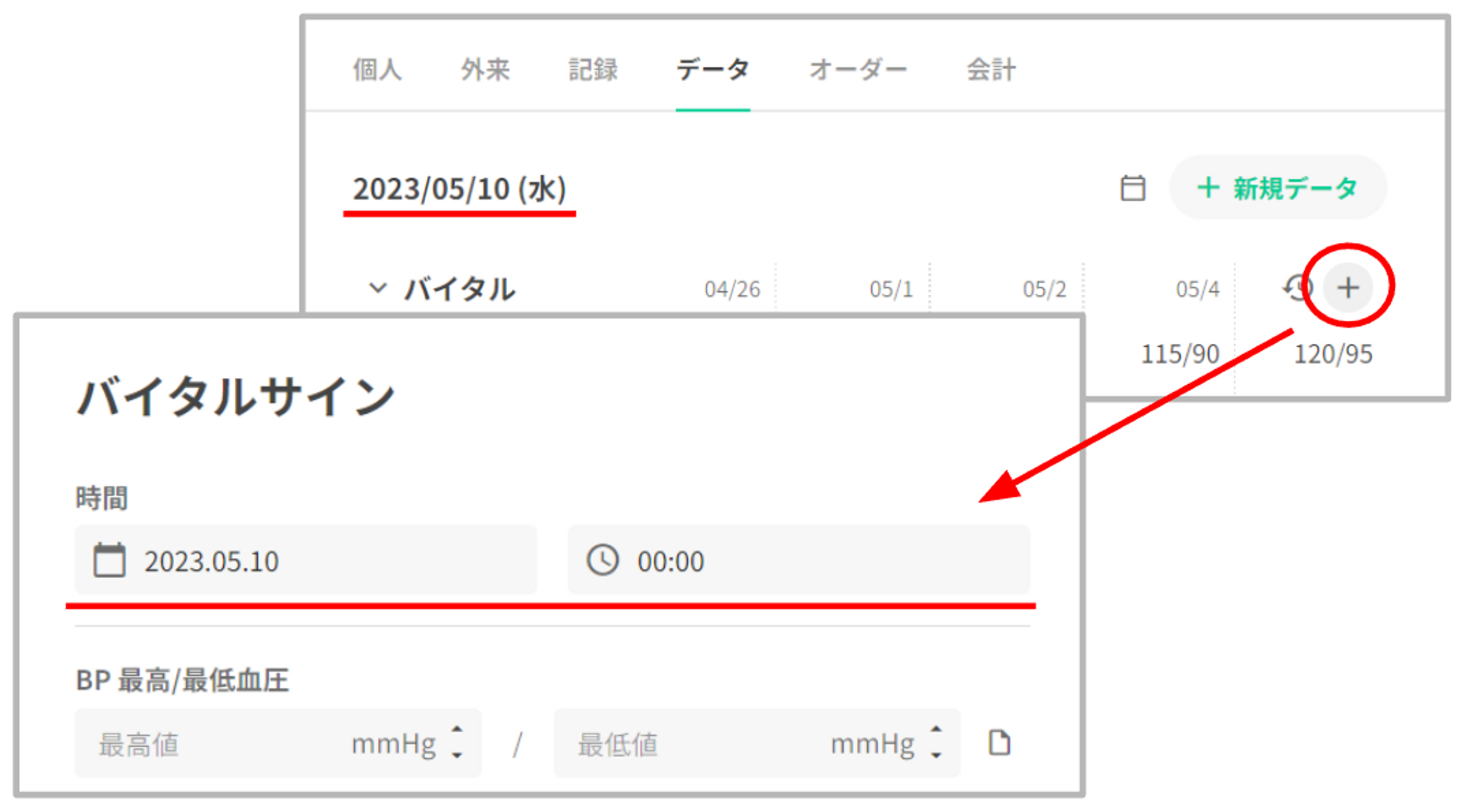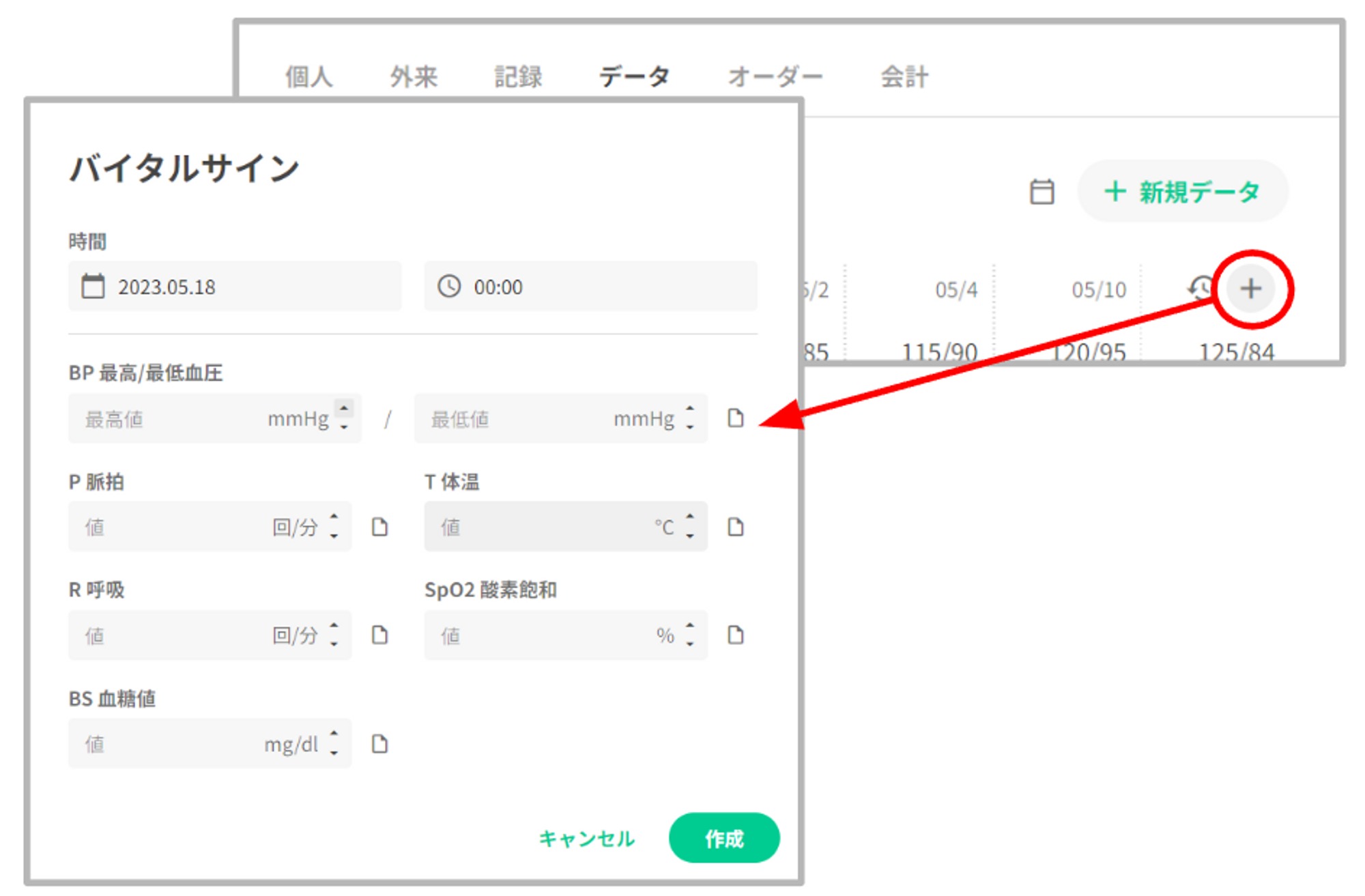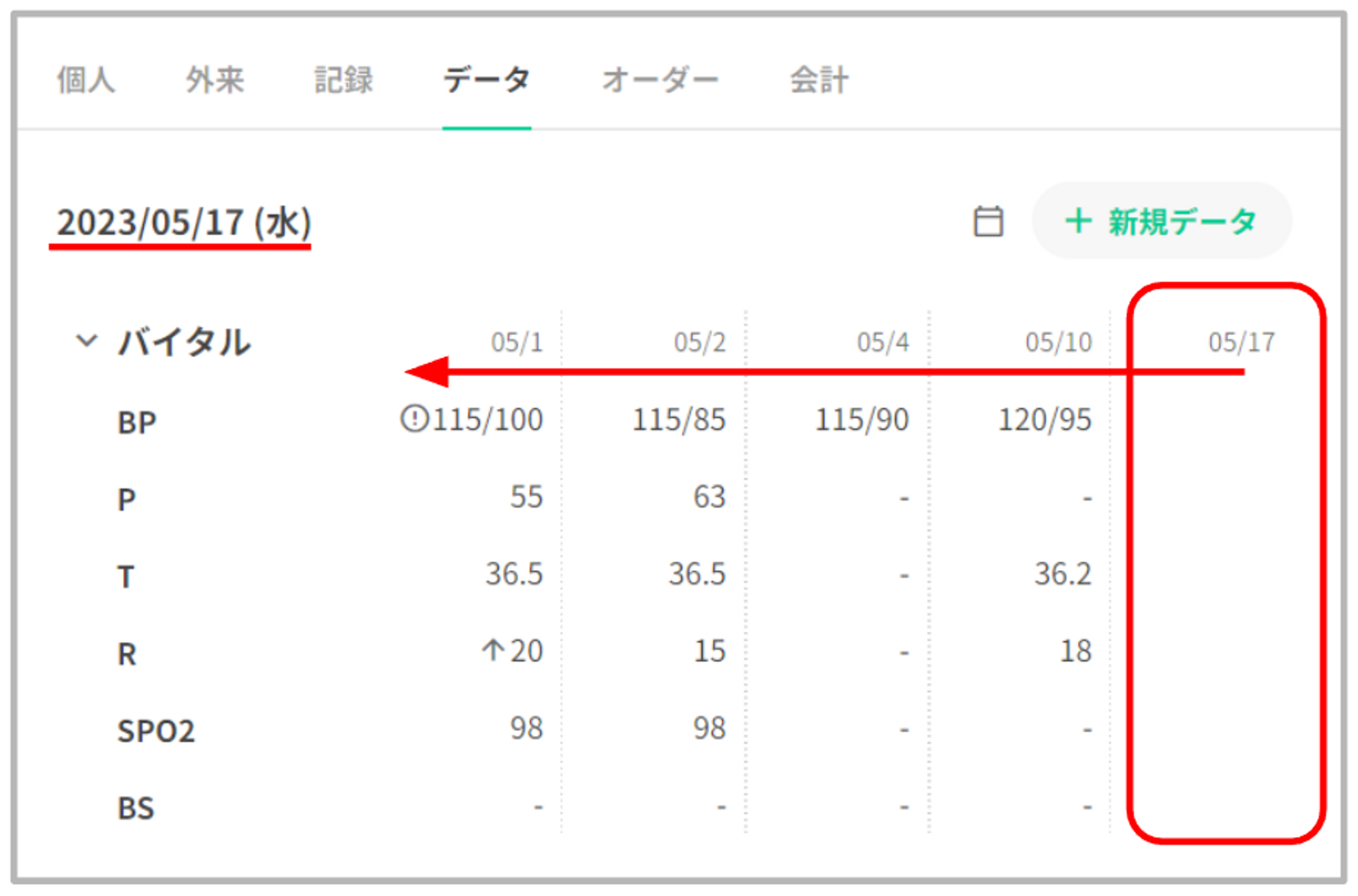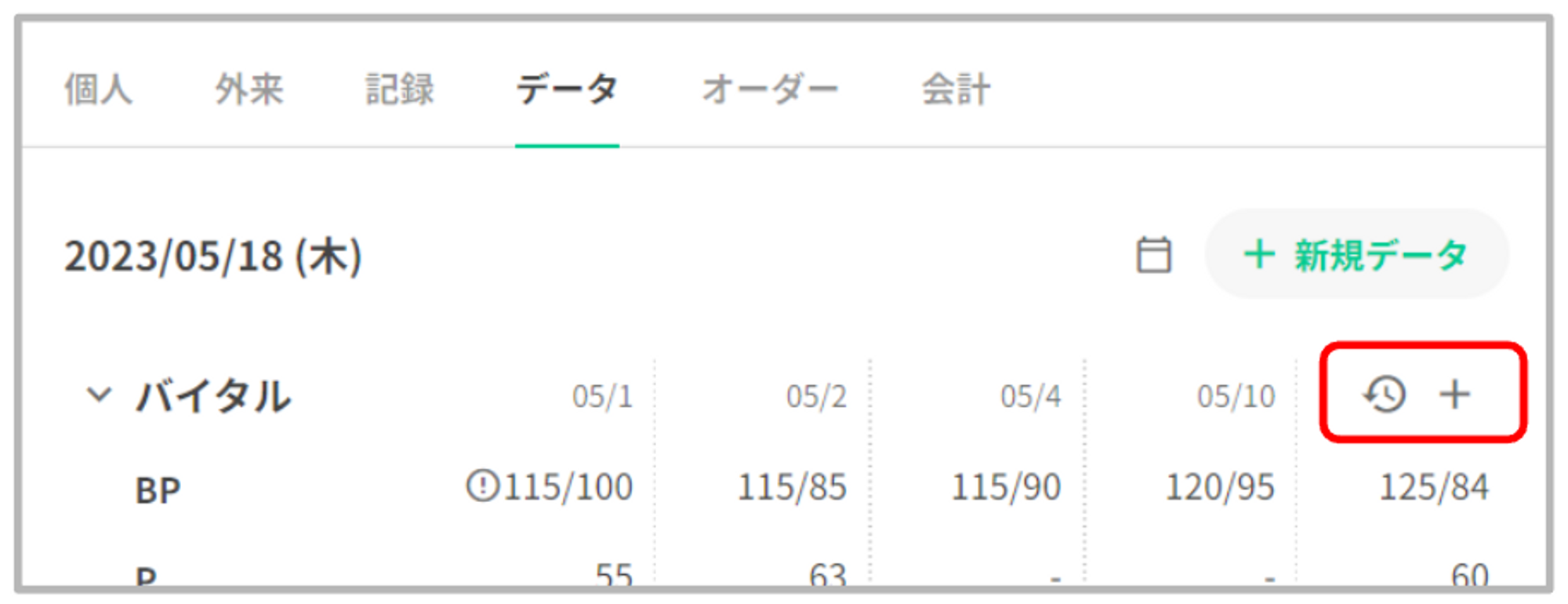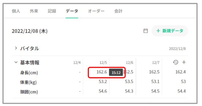 バイタルグラフ下部の右側に「+新規データ」を表示いたします。