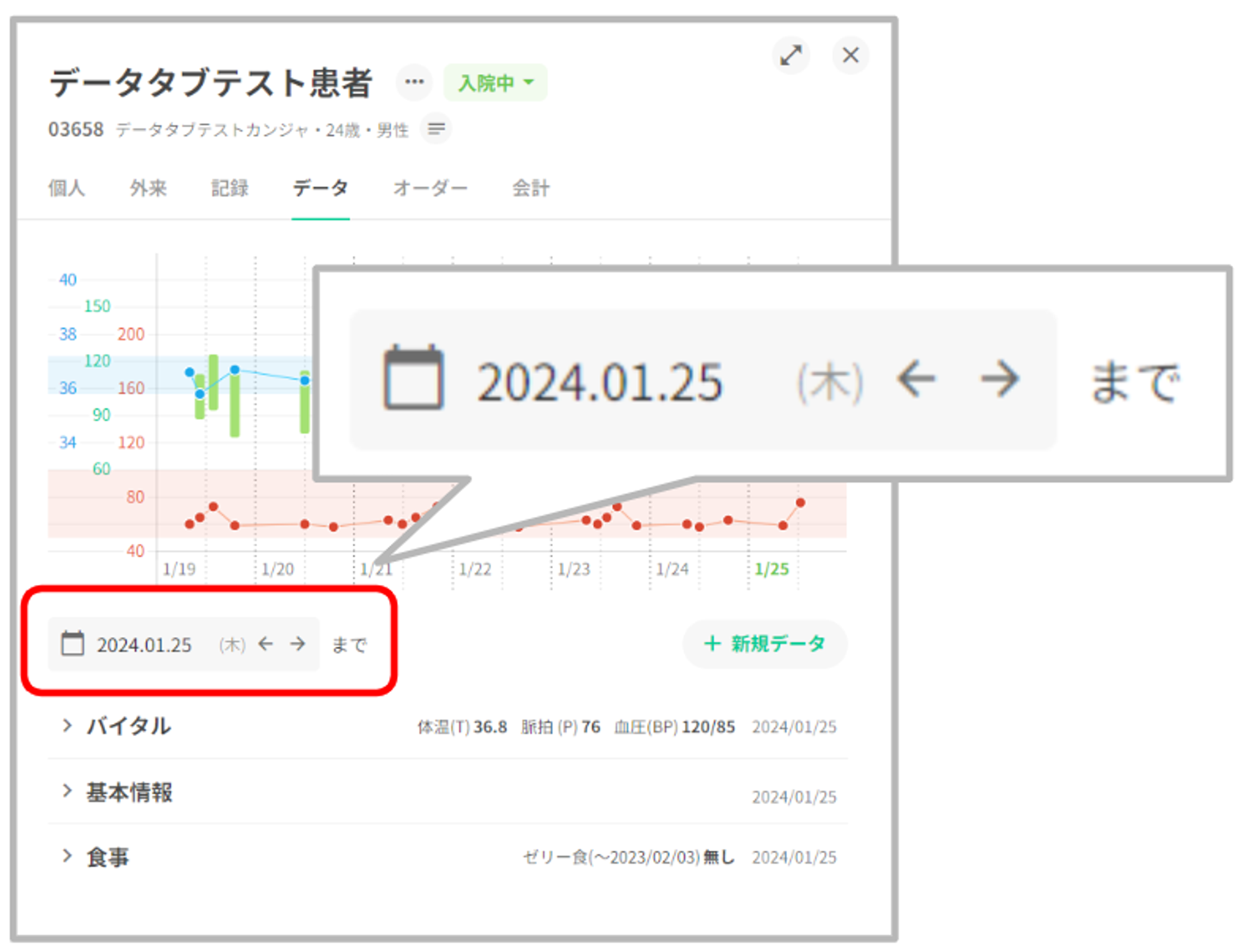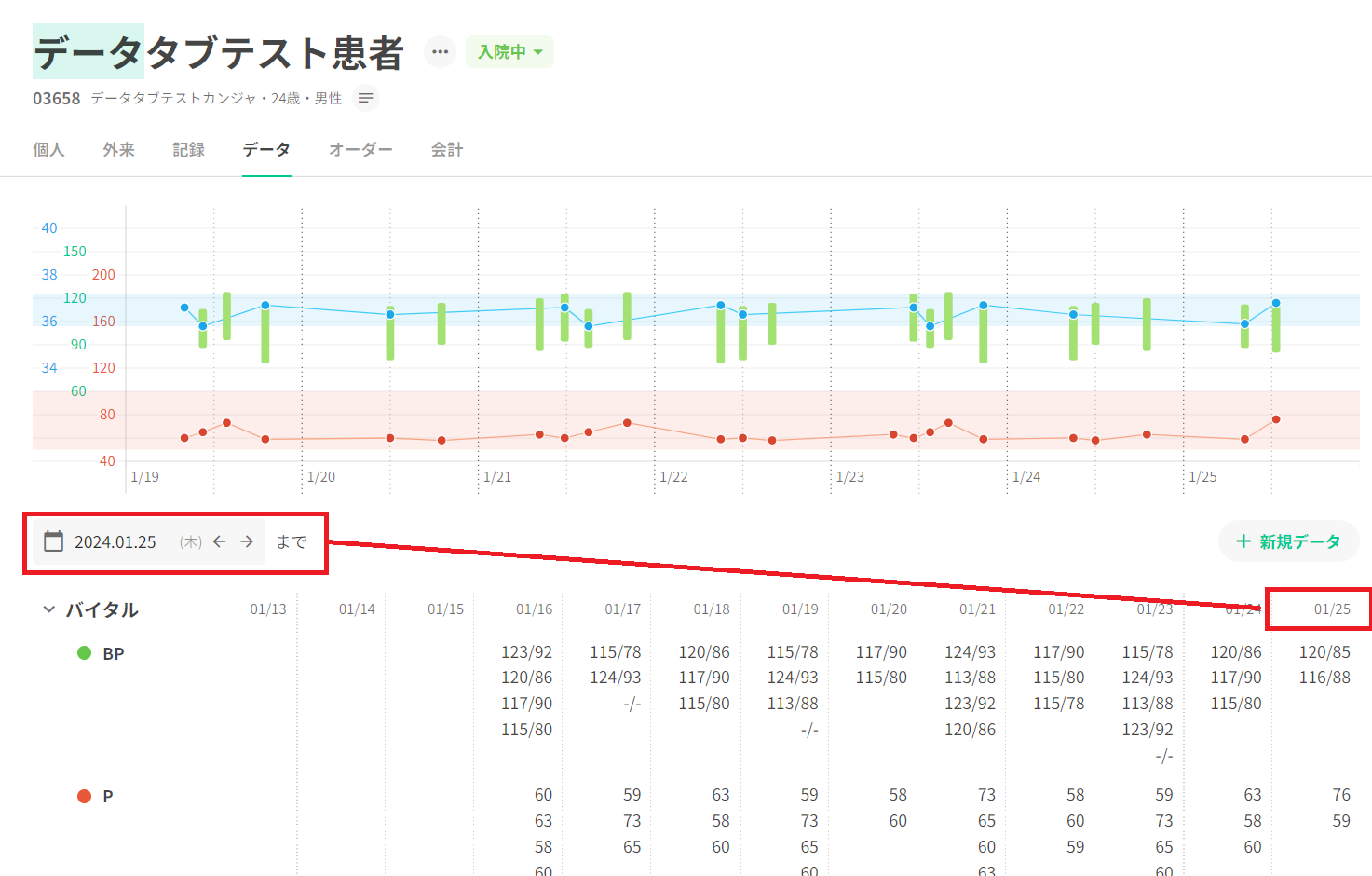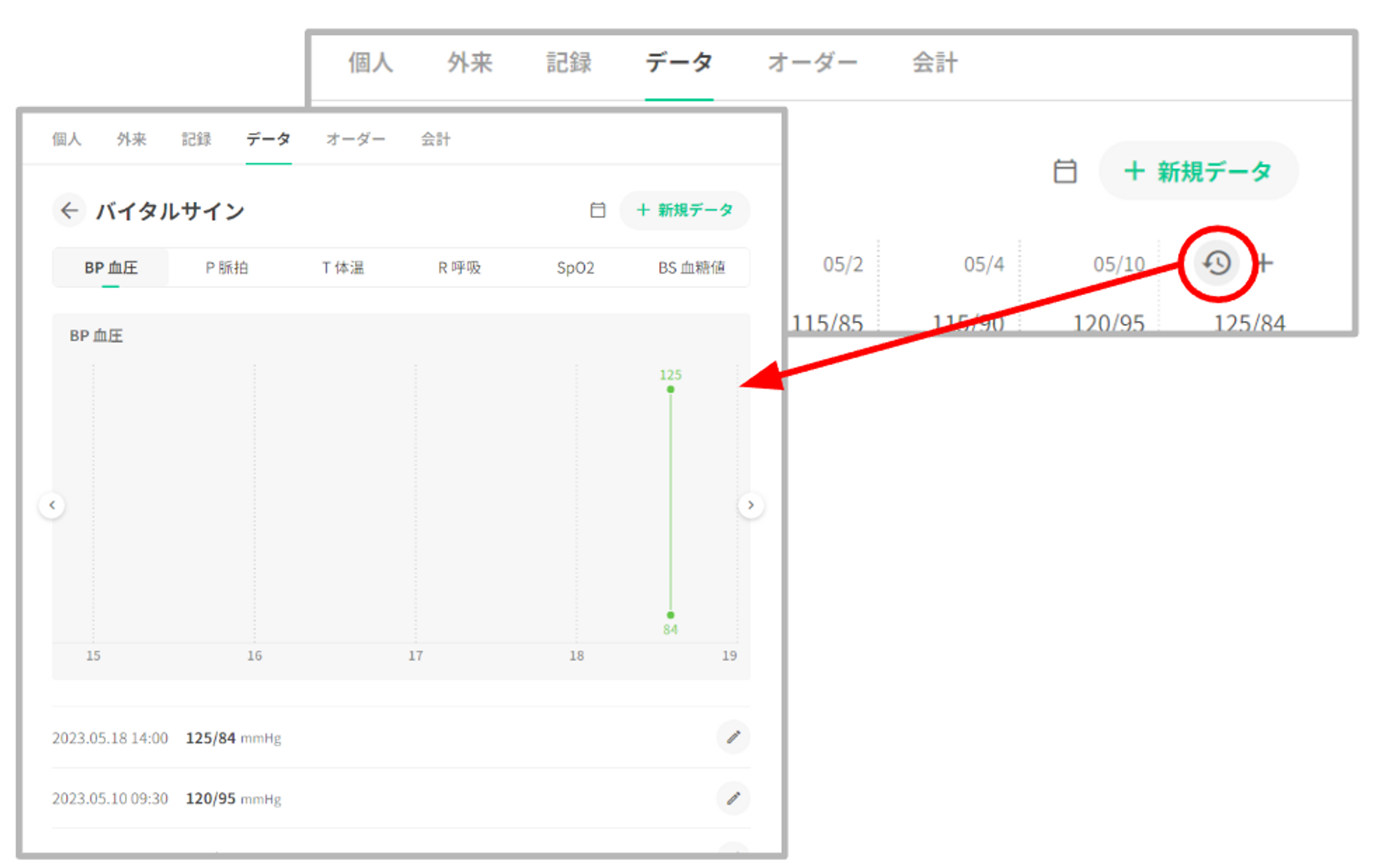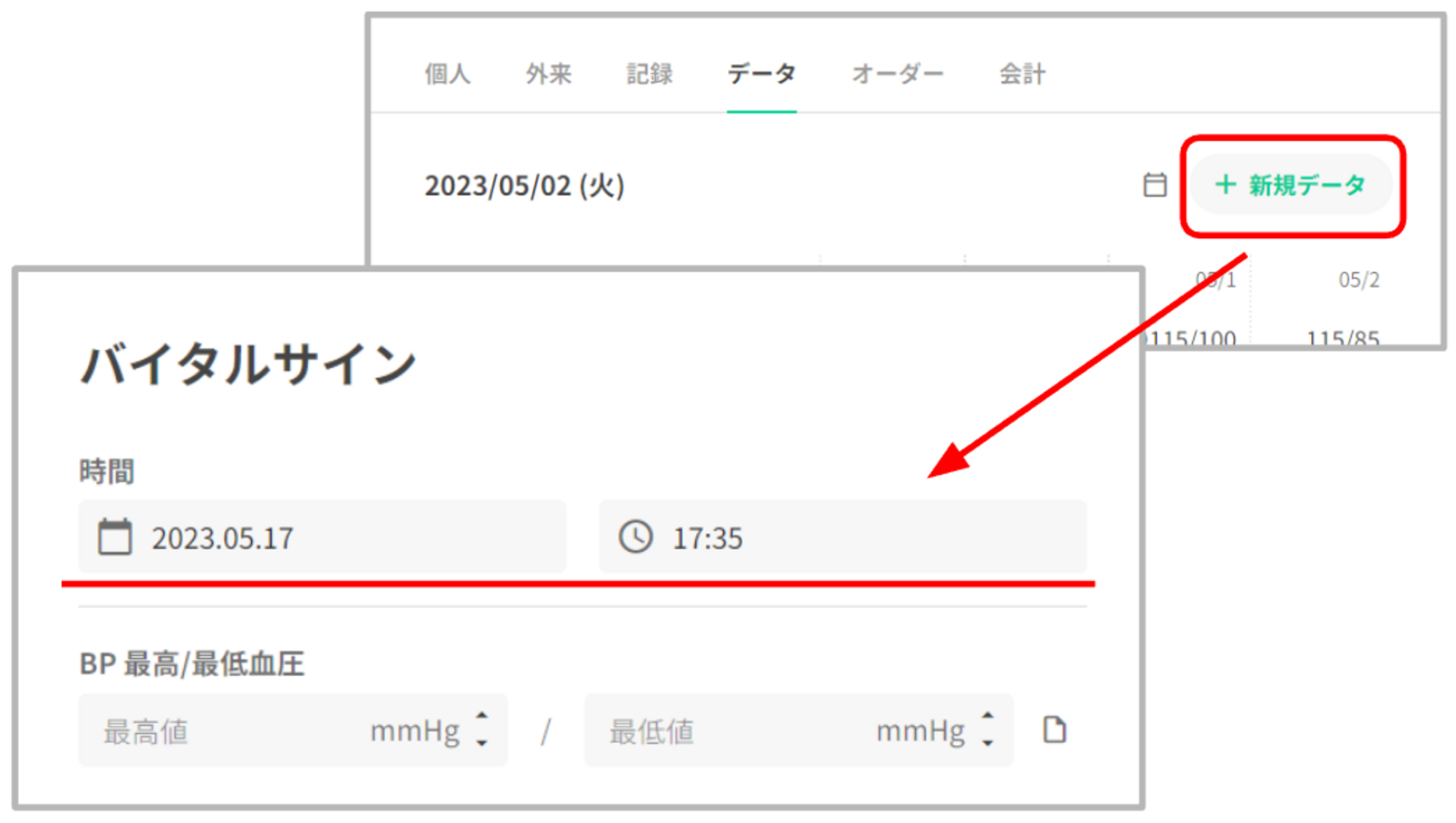 バイタルグラフ下部の右側に「+新規データ」を表示いたします。