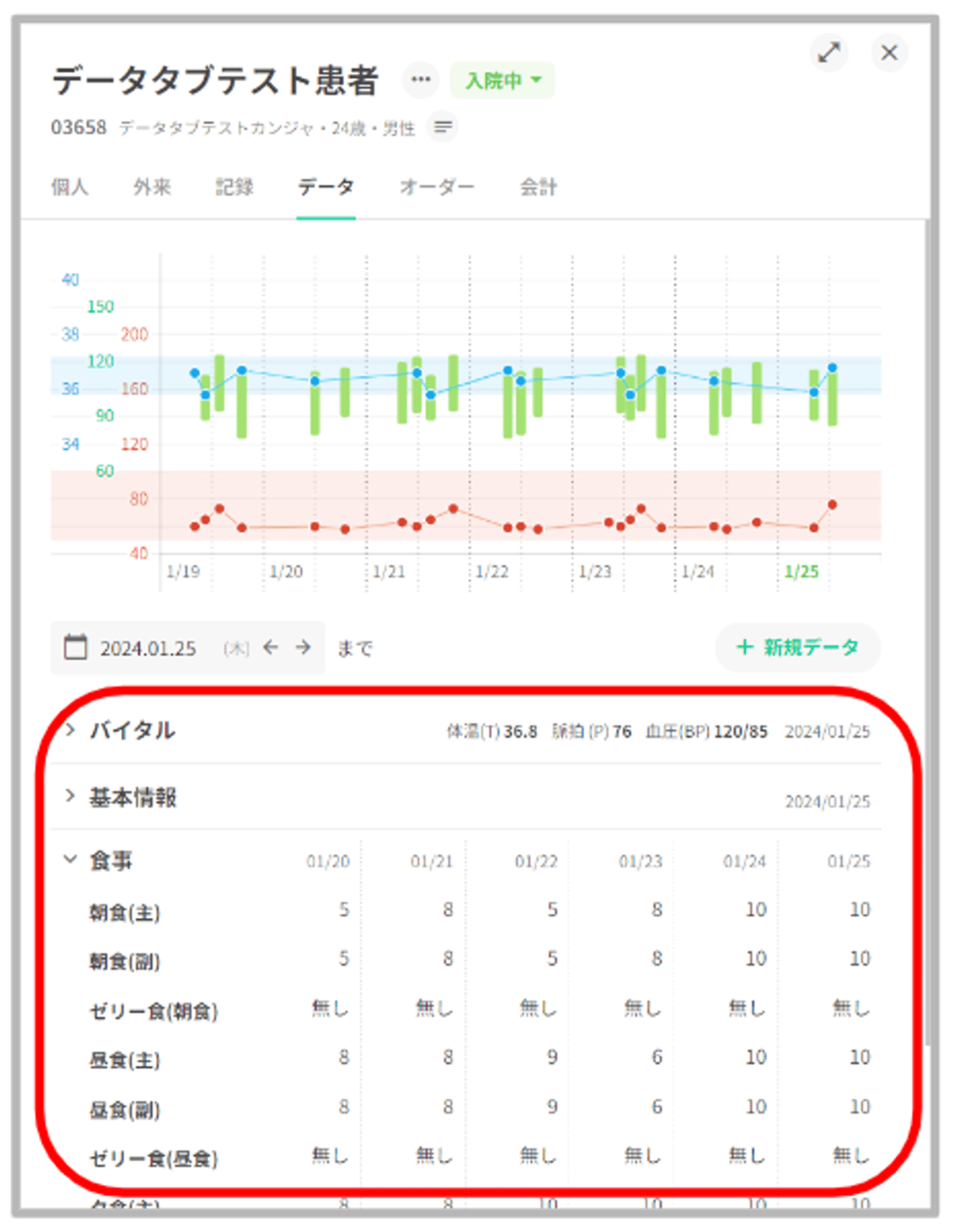 患者データタブの最上部にバイタルグラフを表示いたします。バイタルグラフの詳細についてはこちらをご覧ください。 バイタルグラフの読み取り