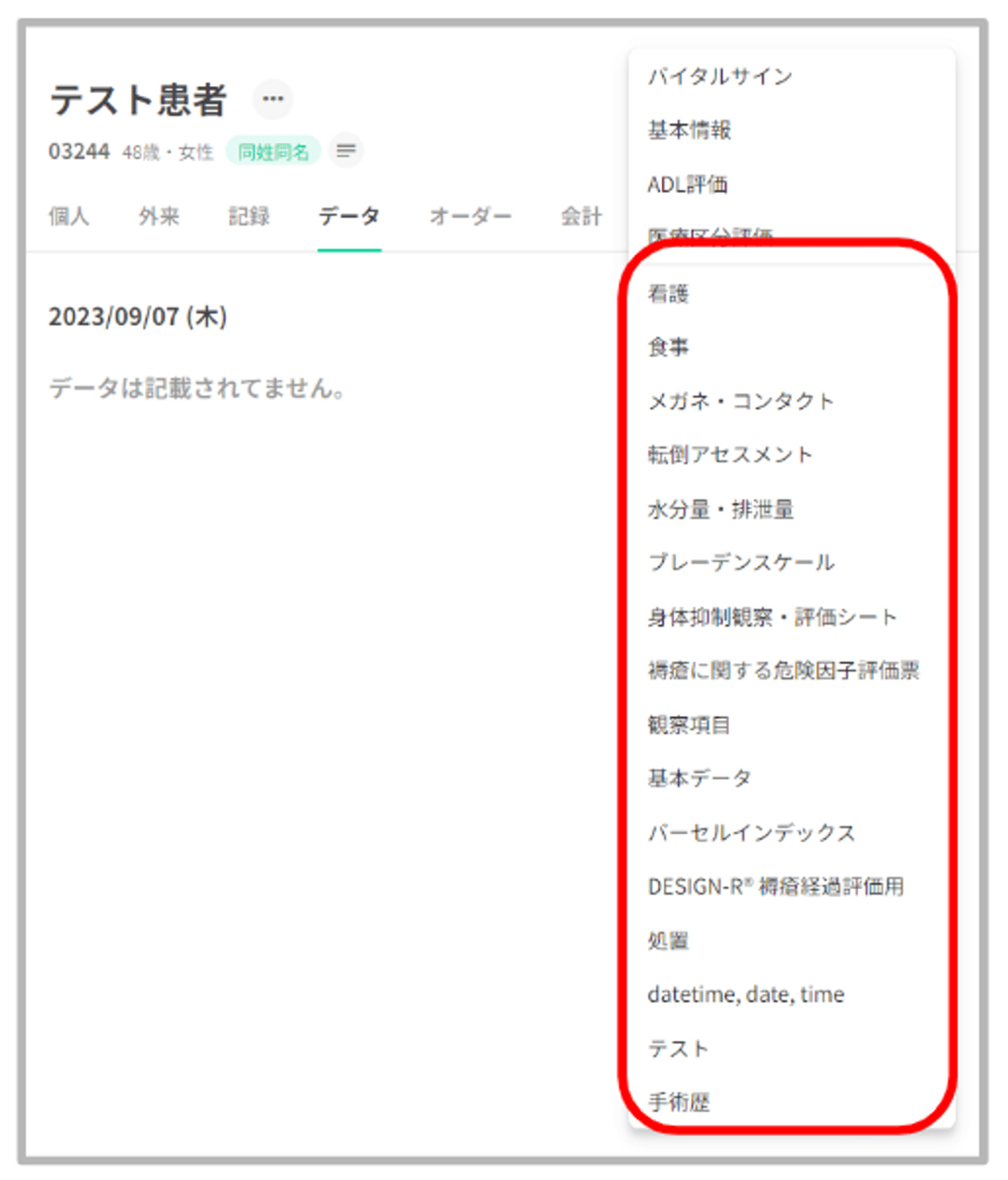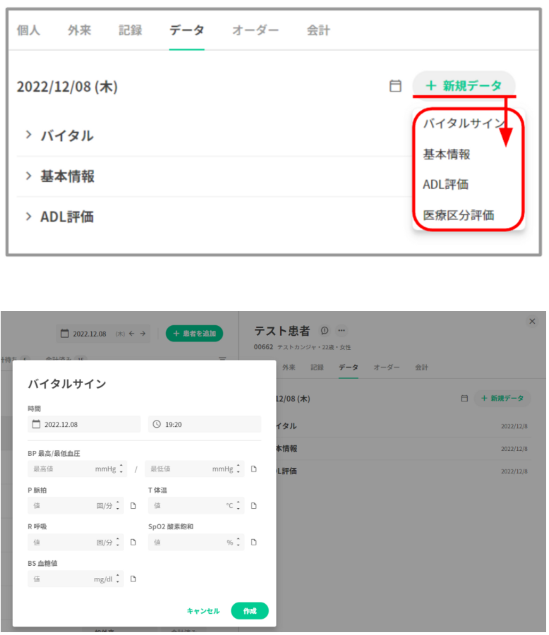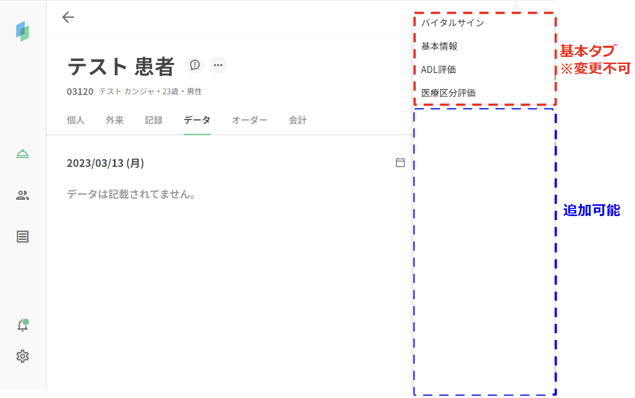 データタブは4つの基本タブ(バイタルサイン、基本情報、ADL評価、医療区分評価)がデフォルトで表示されておりますが、基本タブ以外も医療機関様ごとに追加することが可能です。詳細は以下のマニュアルをご参照ください。