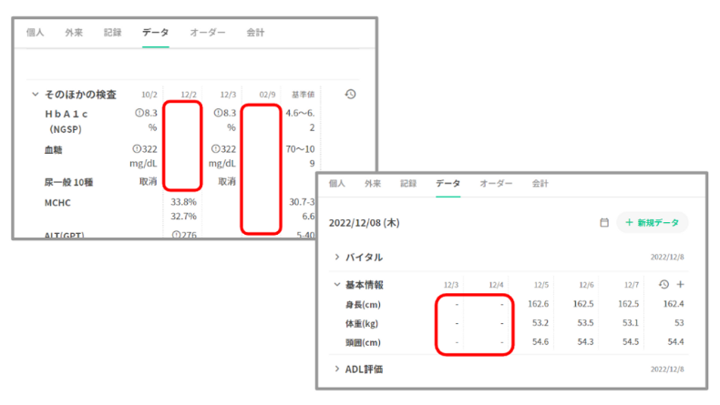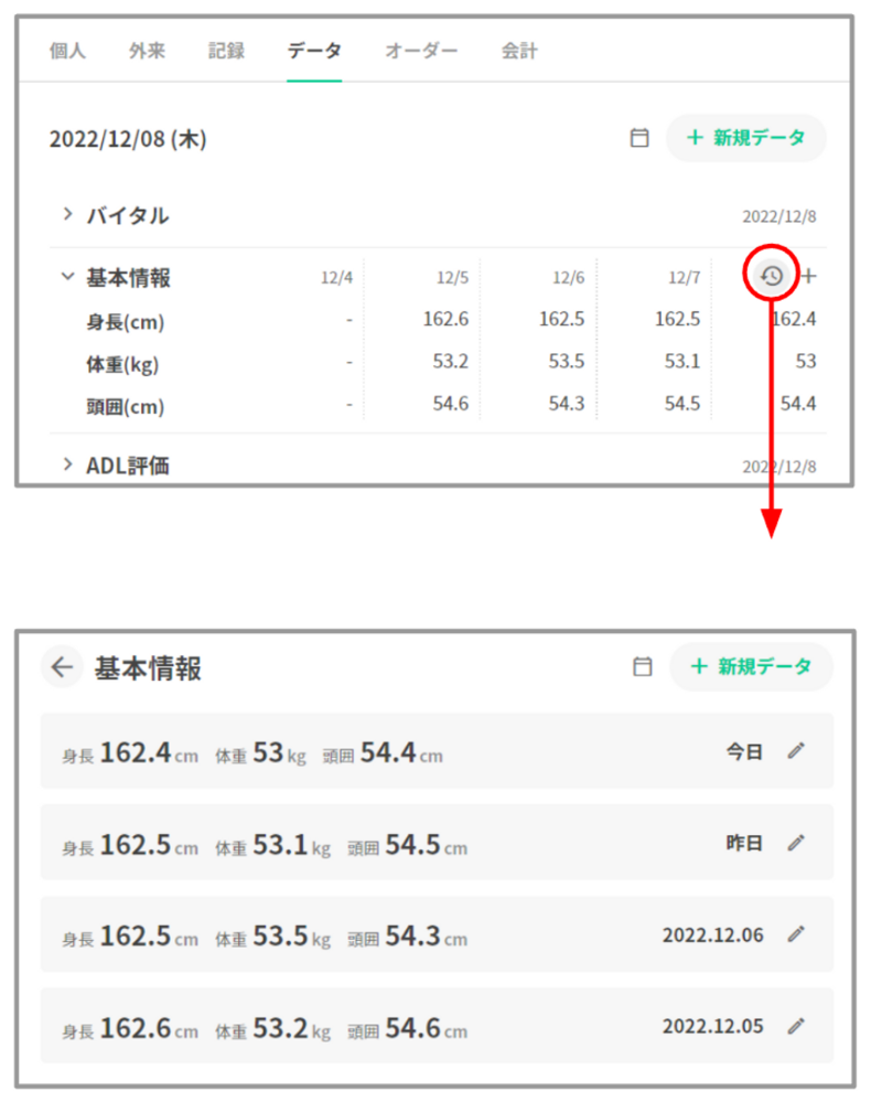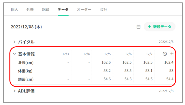 Henry上でのデータタブは温度板を意味しており、体温、血圧等のバイタルサインや症状などの観察結果の入力・閲覧・編集を行う箇所です。記録項目ごとに一覧で表示されます。