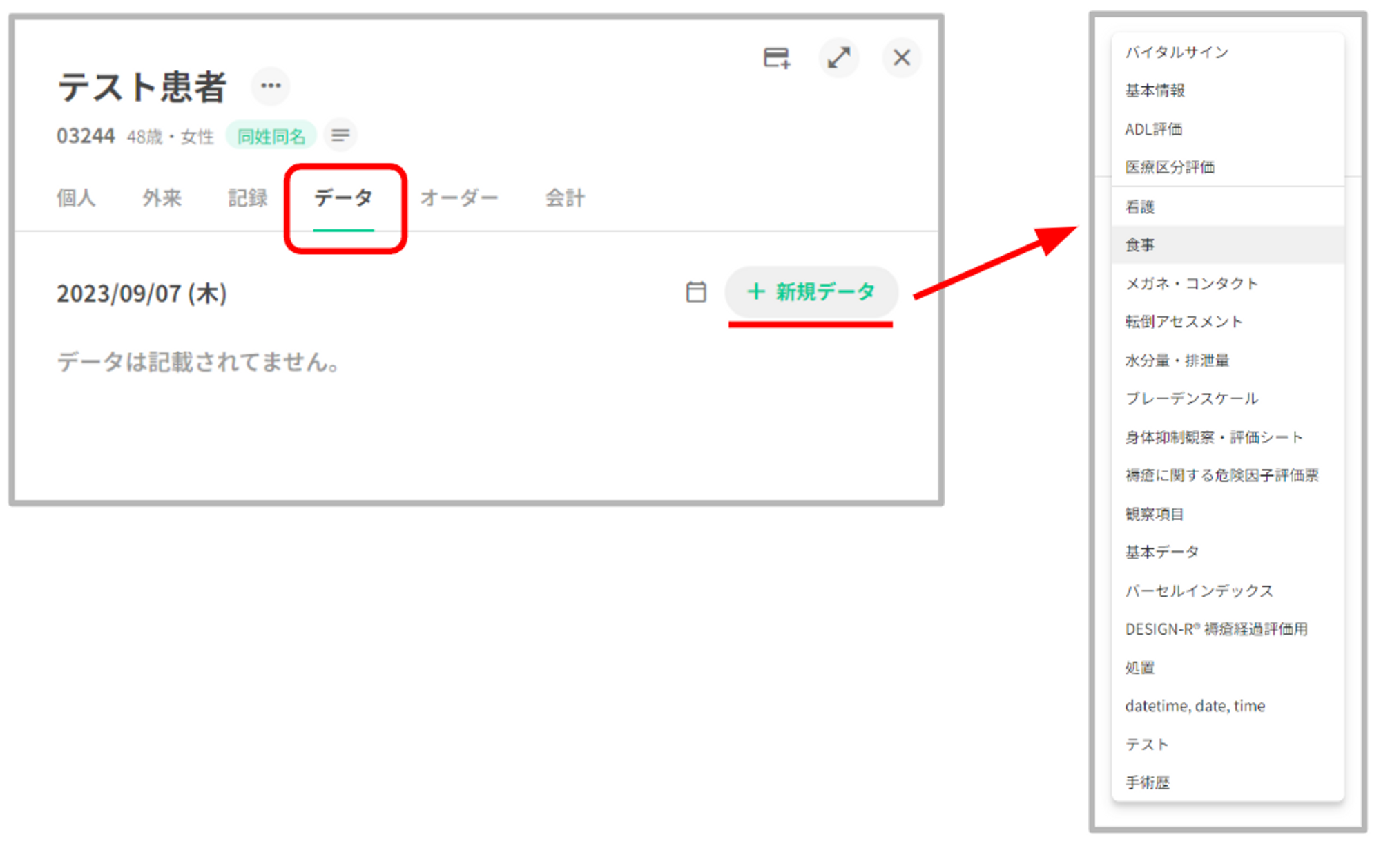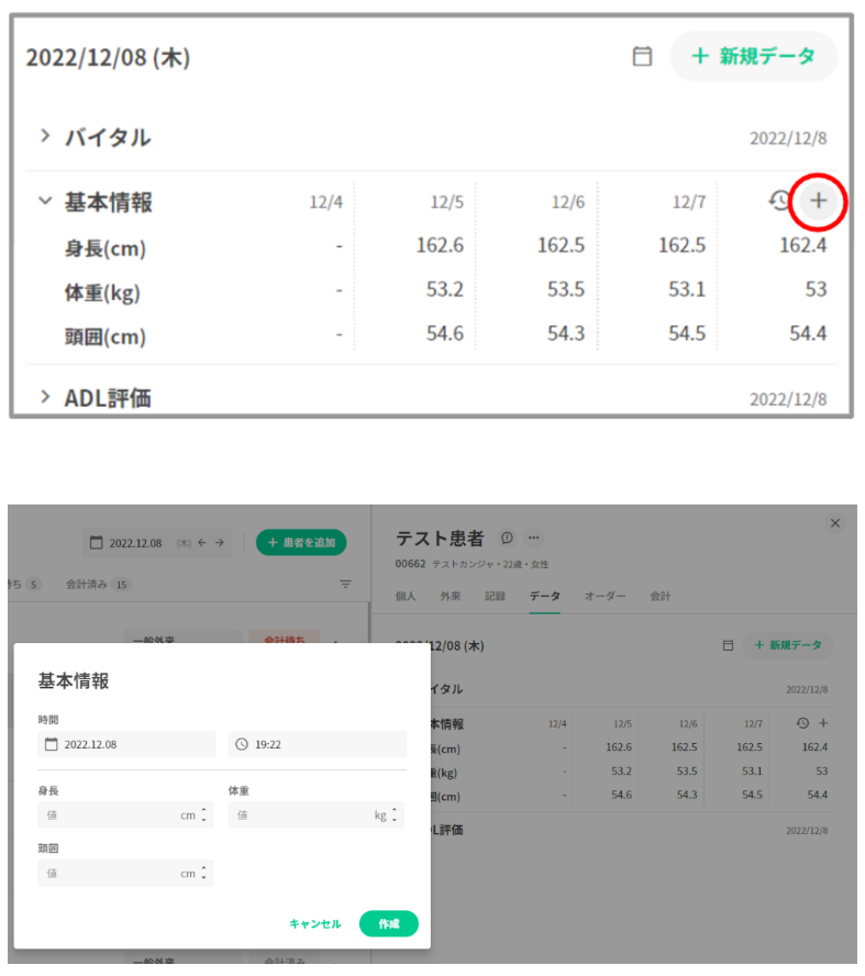 患者データータブの「+新規追加」の押下で表示される項目のうち医療区分より下に表示されている項目がカスタム数値記録となります。