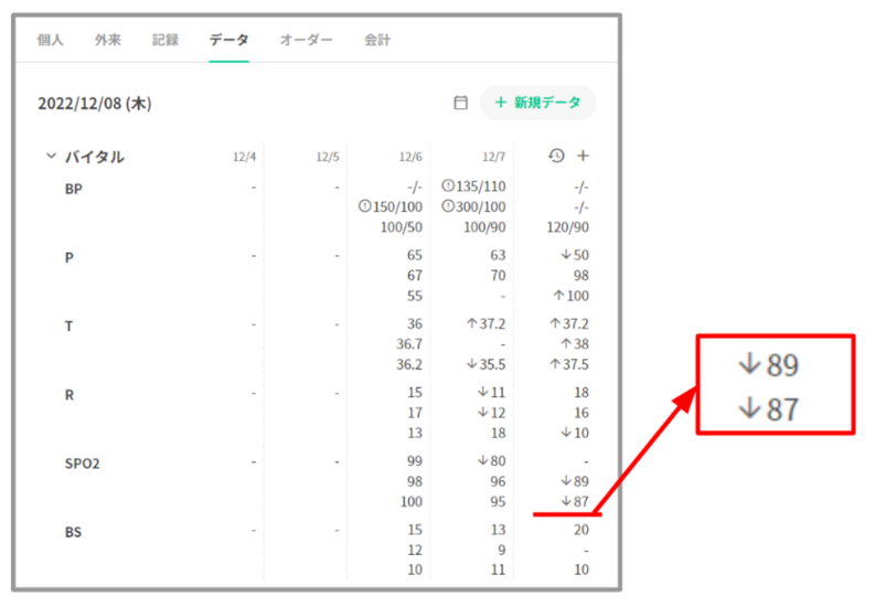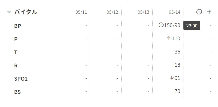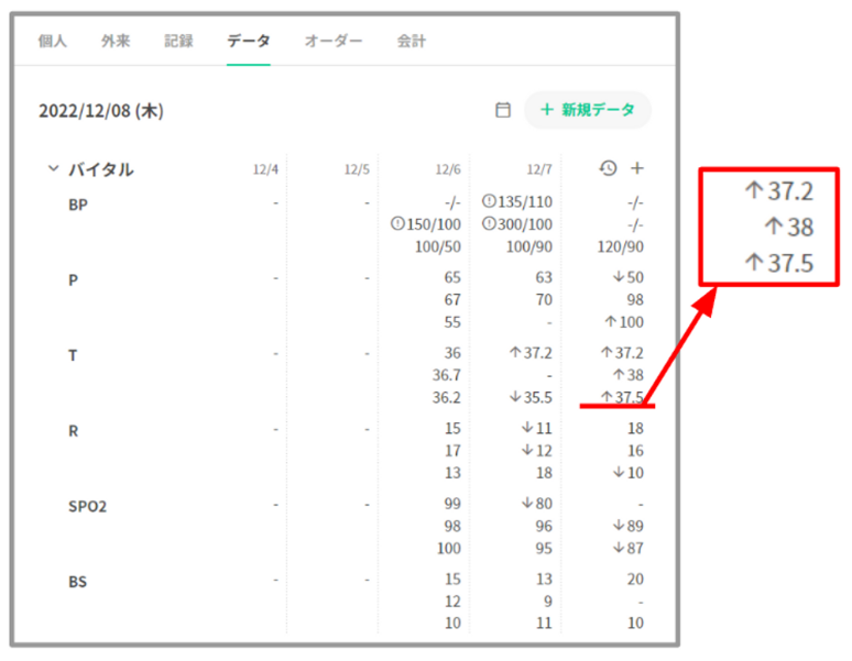 体温や脈拍等で異常値を示す場合、上限値を超えている場合は「↑」が、下限値を超える場合は「↓」が数値の横に表示されます。
