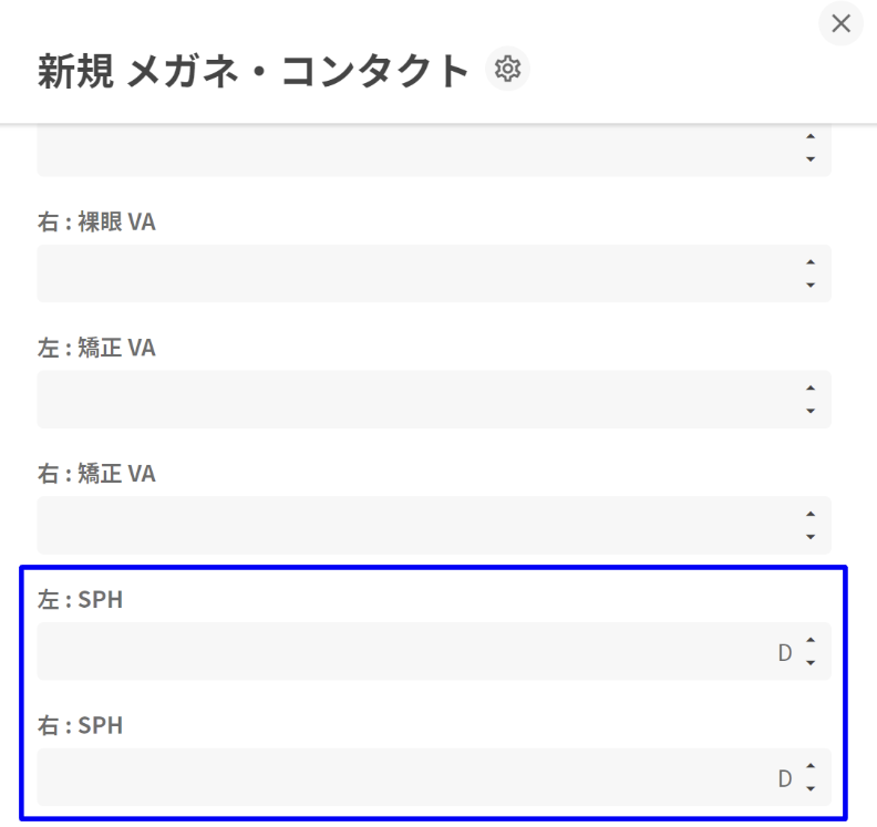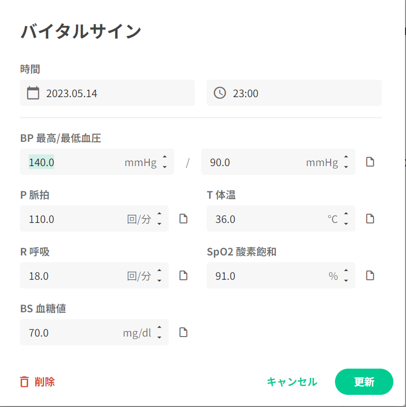 カスタム数値記録は患者様ごとに項目をカスタマイズすることが可能となっており、カスタマイズ設定画面で追加した項目を有効にすると入力欄が表示されます。