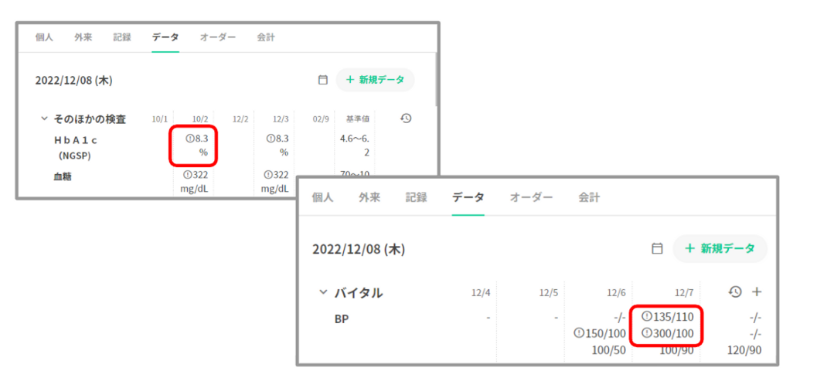 血圧や院外検査項目で異常値を示す場合、数値の横に「!」が表示されます。