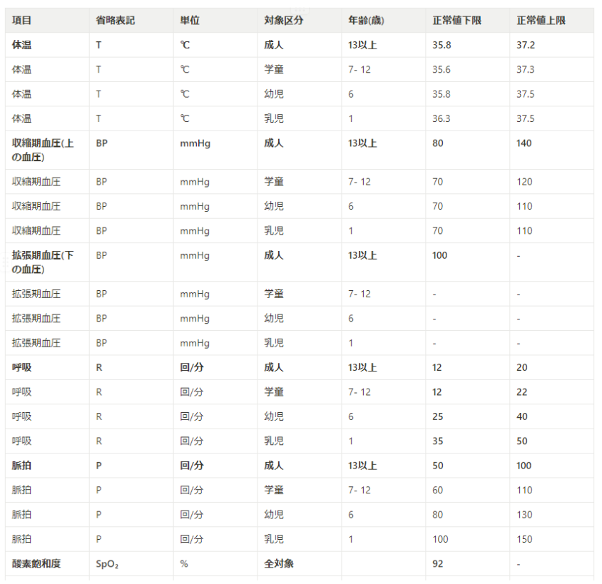 バイタルの各項目別の正常値の範囲は対象区分毎に下記の通りとなります。