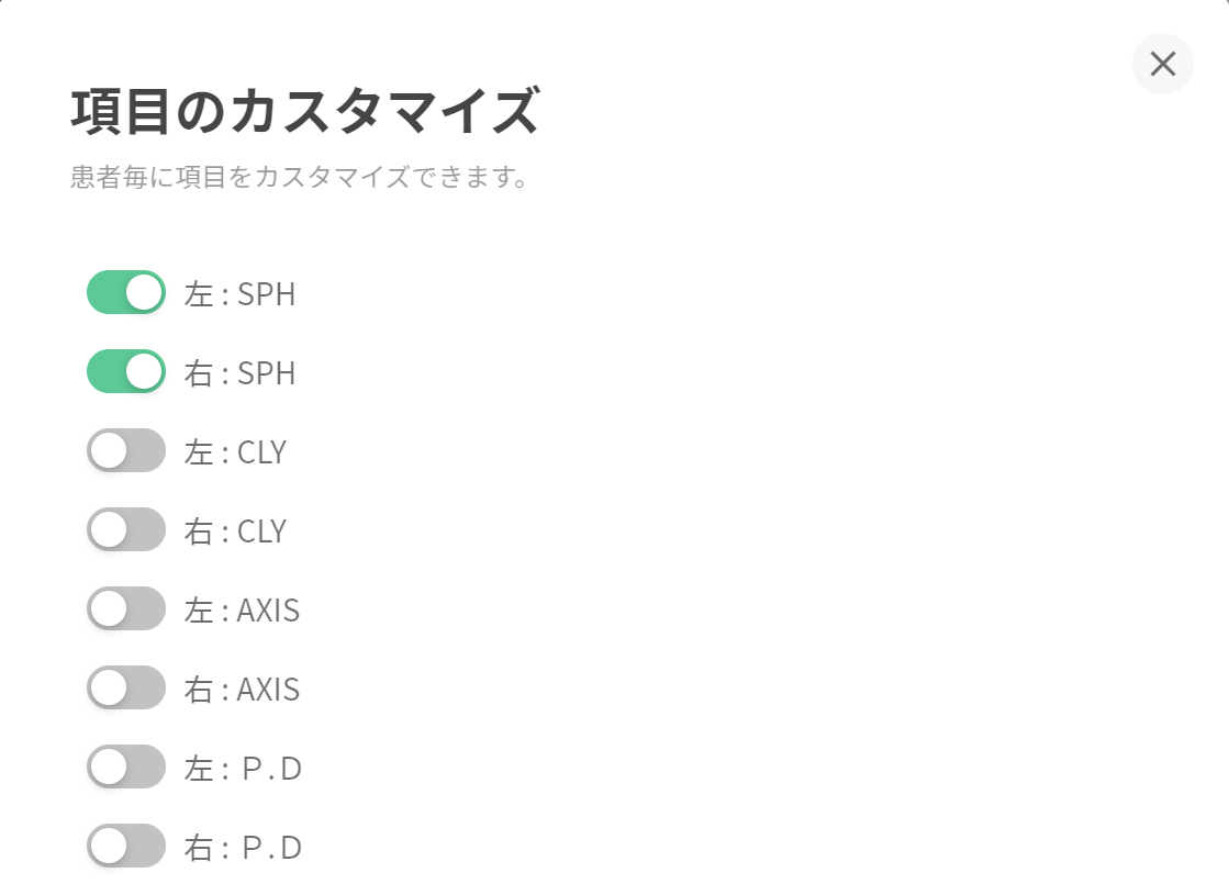 表示されている項目は医療機関様によって異なり、カスタム設定のない項目もありますのでご留意ください。