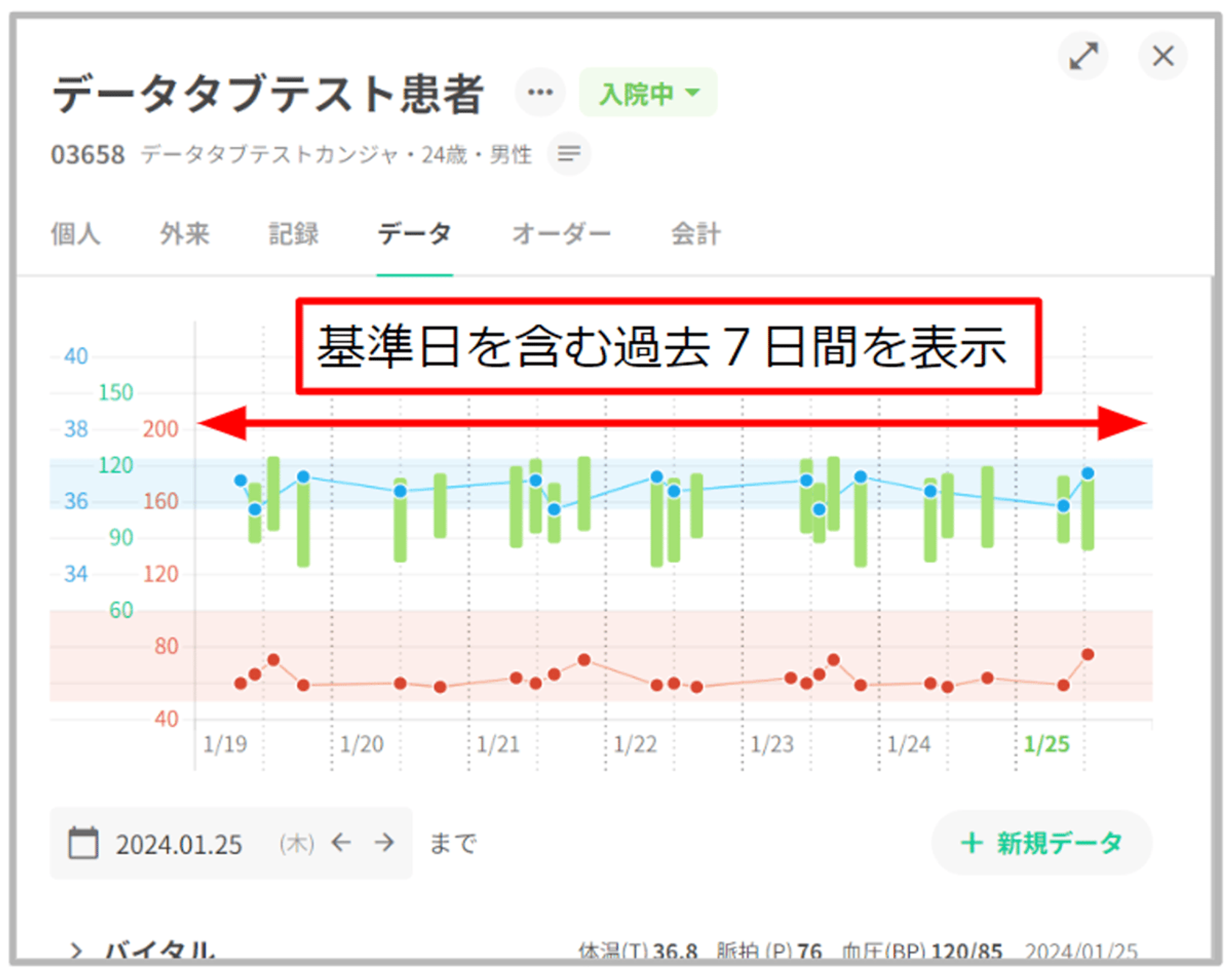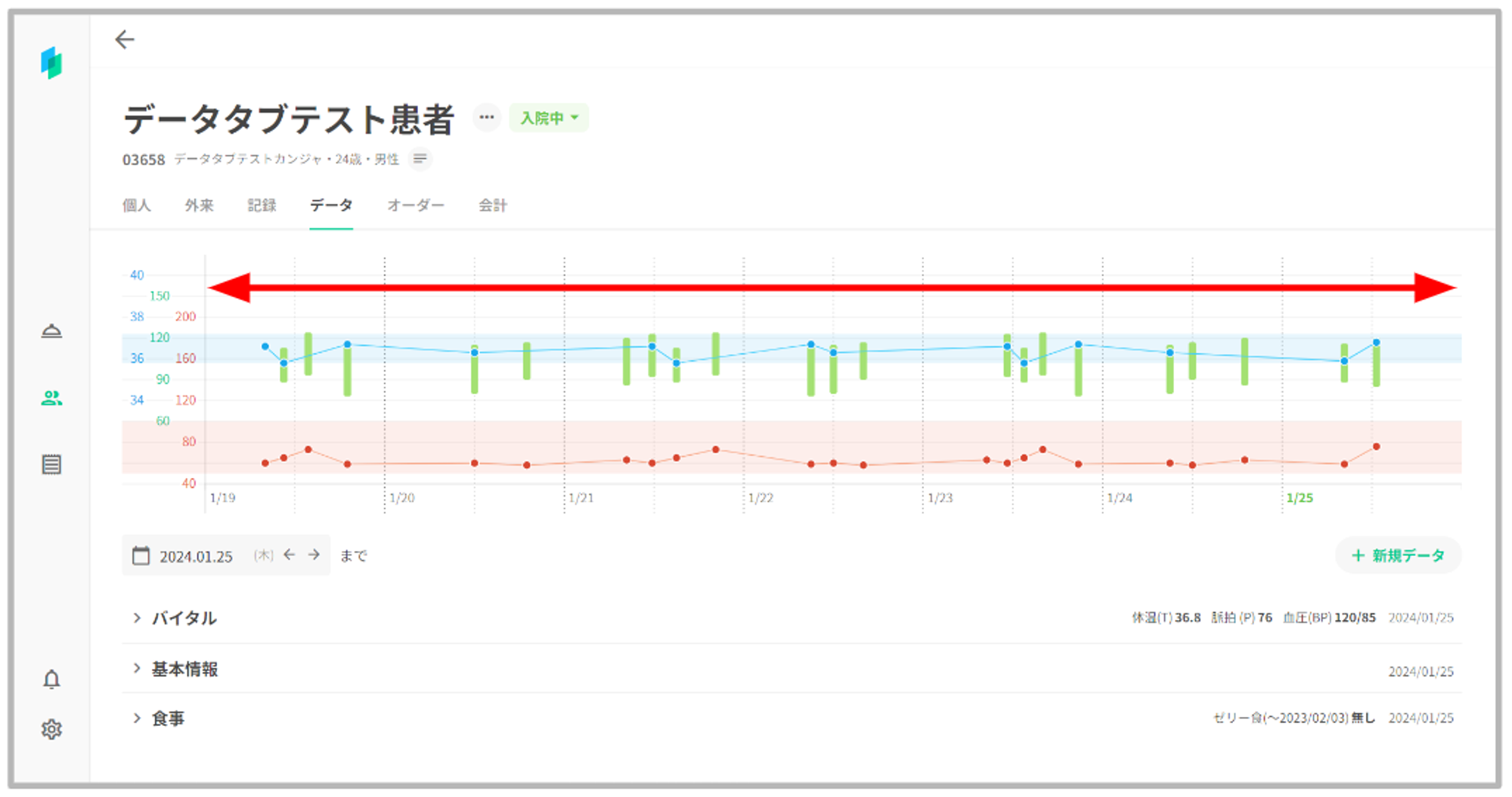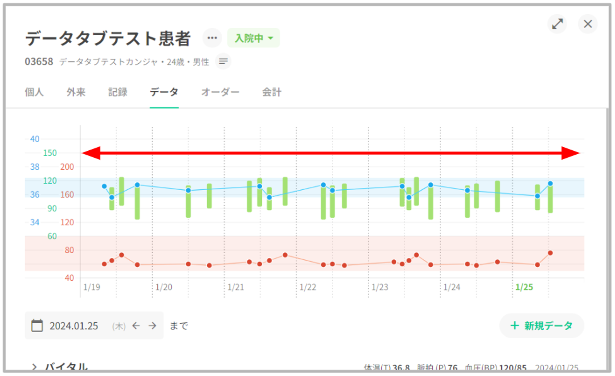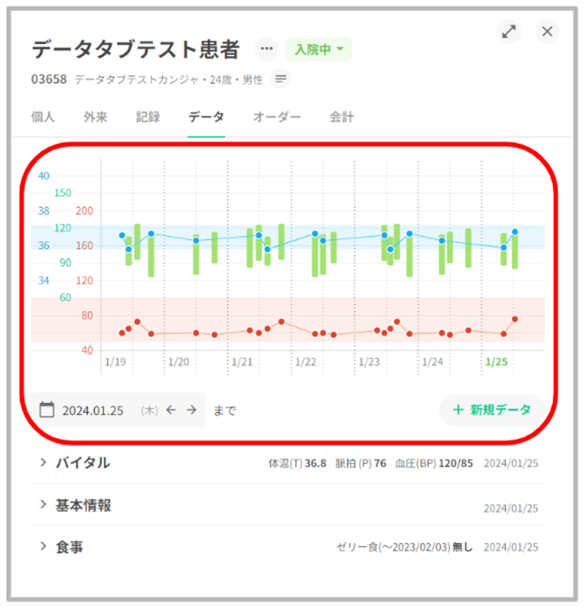 患者データタブの最上部にバイタルグラフを表示いたします。