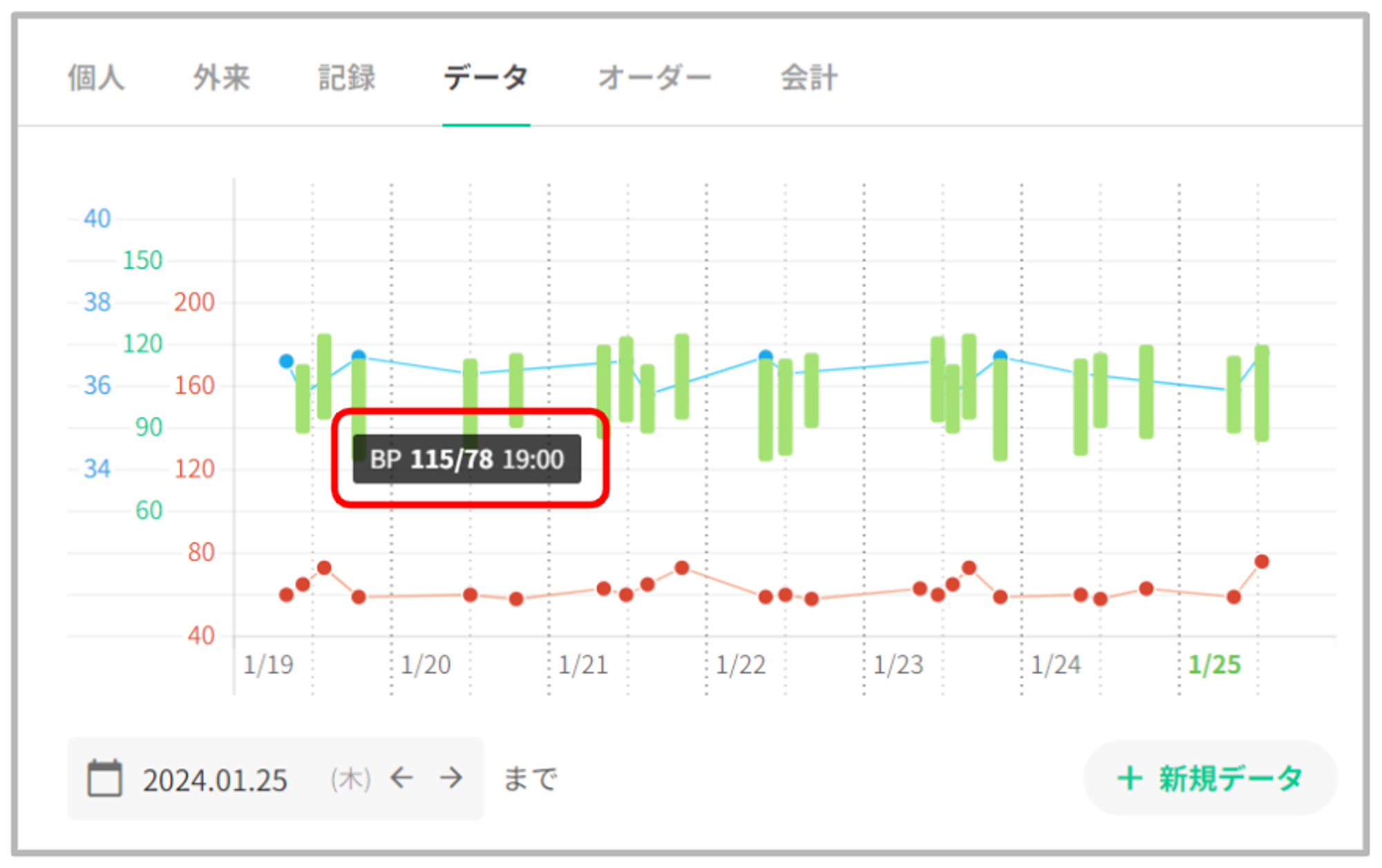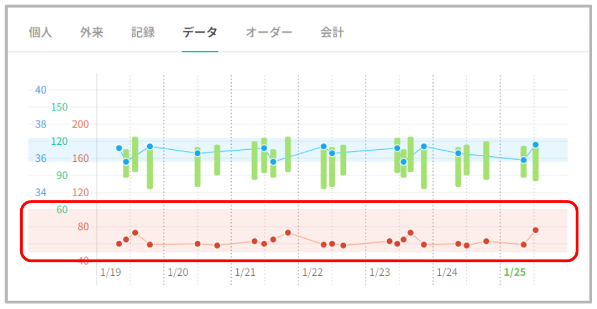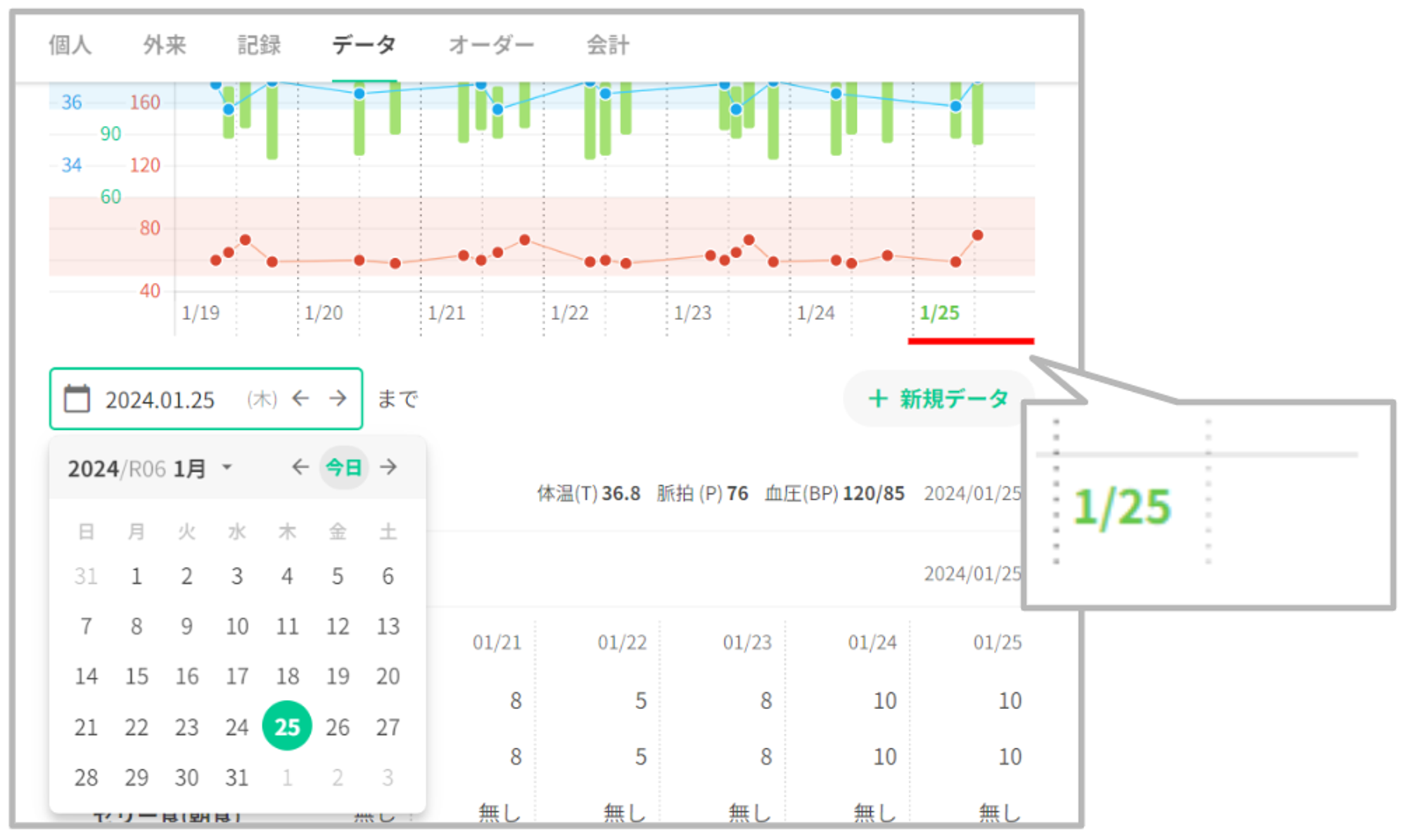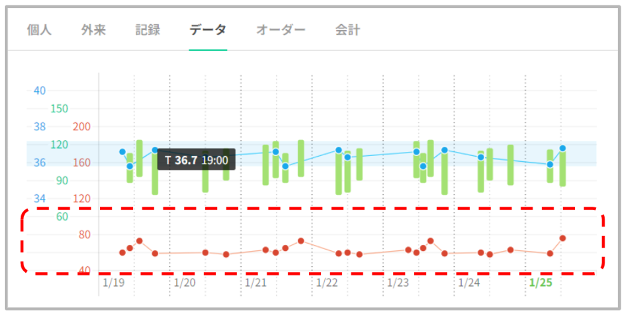 患者データタブの最上部にバイタルグラフを表示いたします。