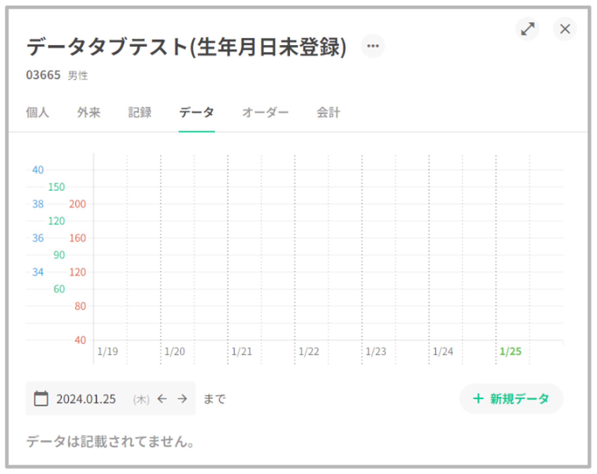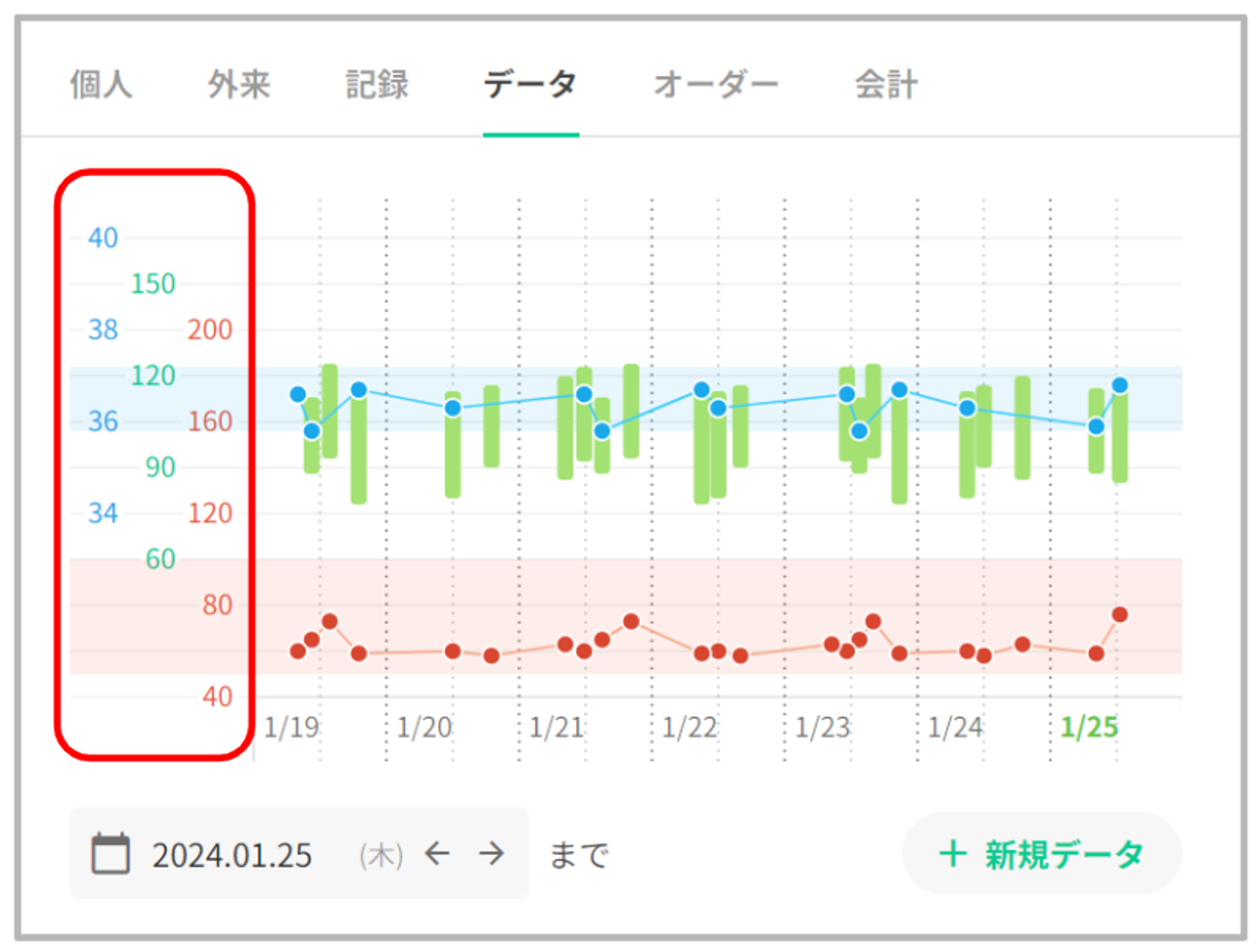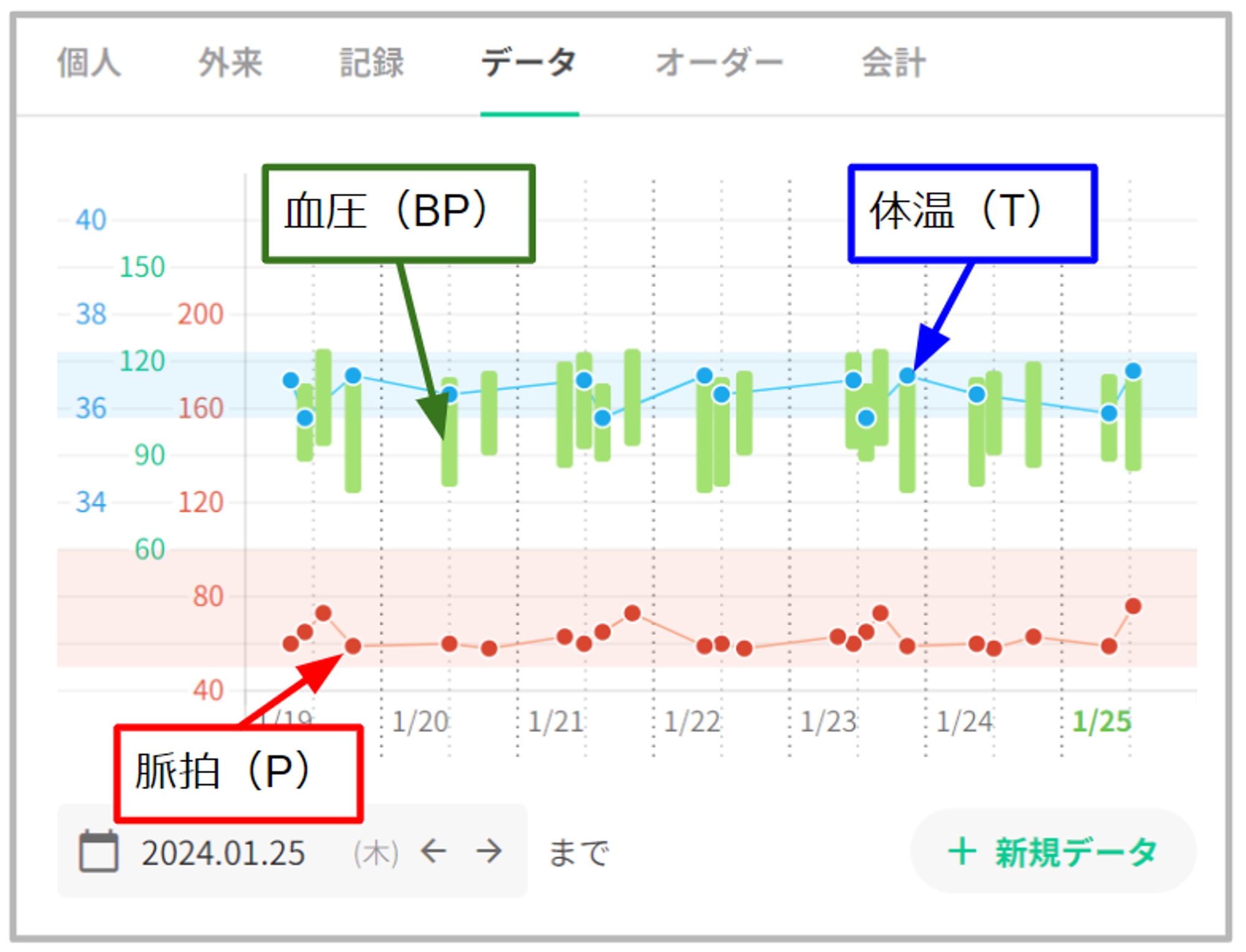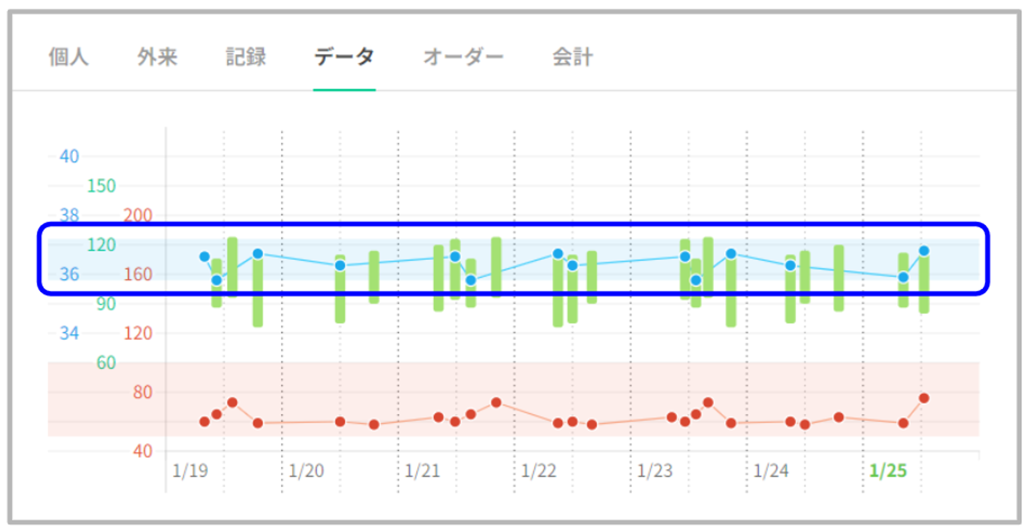 患者データタブの最上部にバイタルグラフを表示いたします。