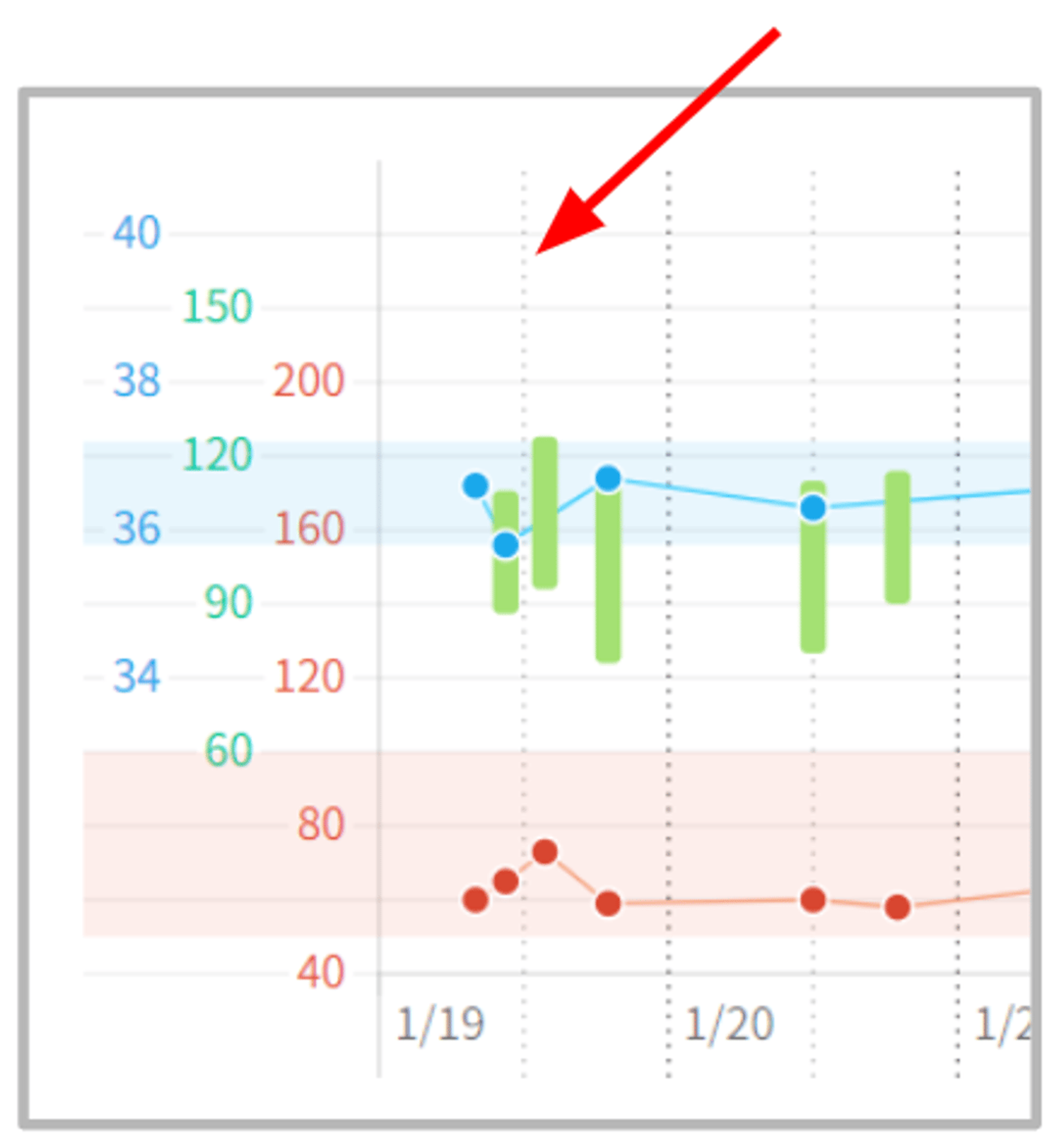 脈拍の正常範囲は、赤色でグラフ上に表示いたします。