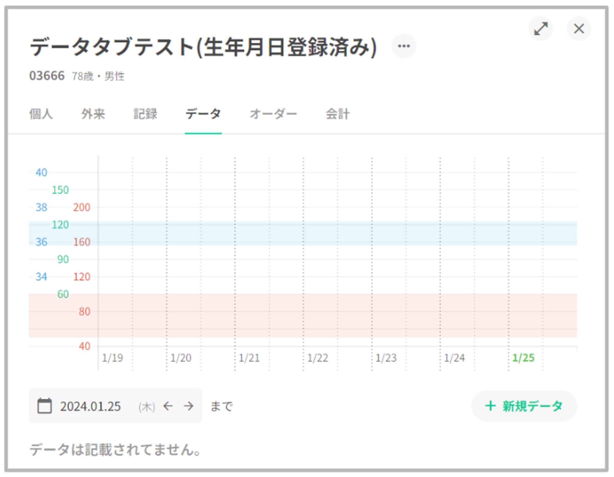 血圧や脈拍の値にカーソルを合わせ、体温以外の項目にフォーカスされると、体温の正常範囲は非表示となります。