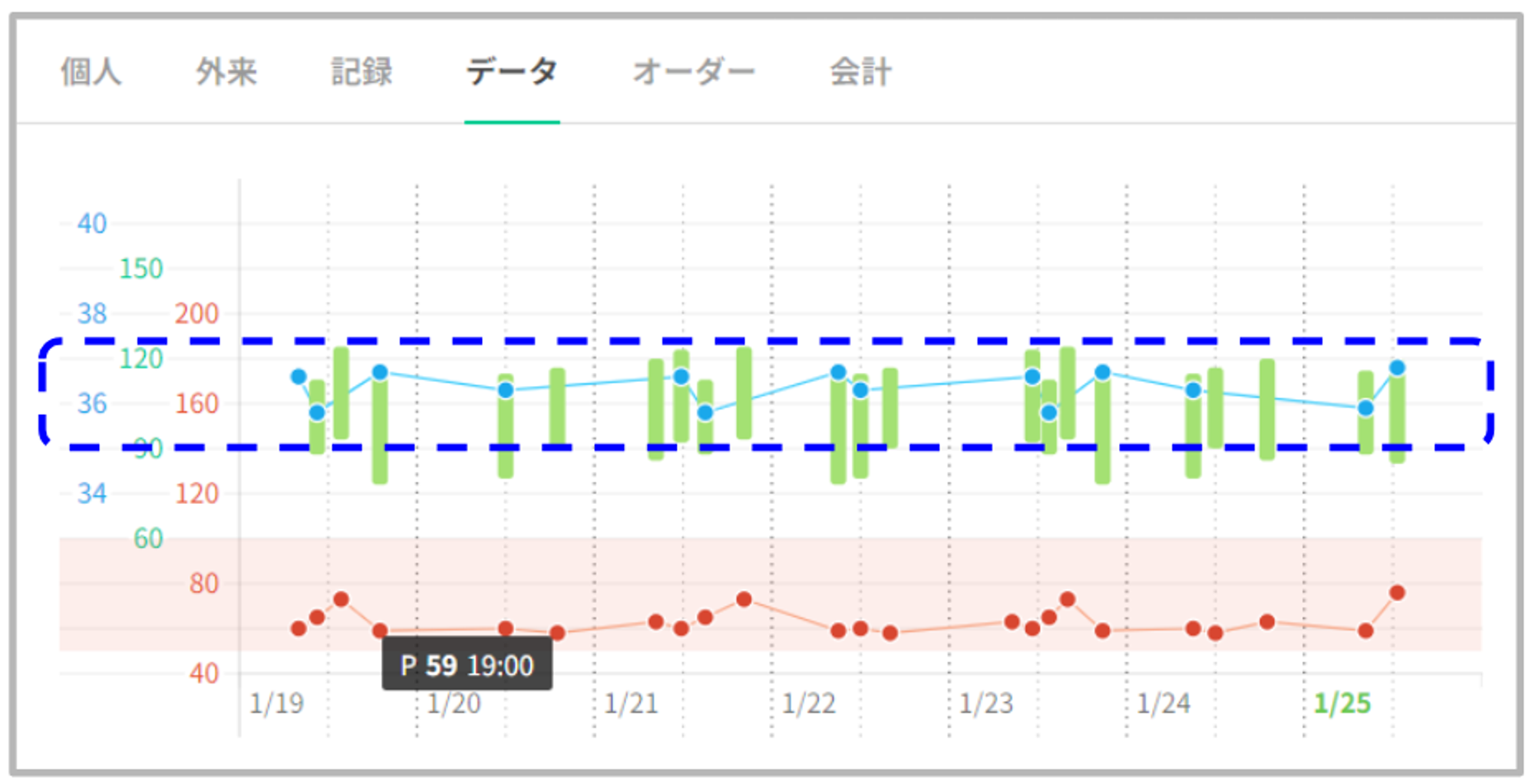 血圧や体温の値にカーソルを合わせ、脈拍以外の項目にフォーカスされると、脈拍の正常範囲は非表示となります。