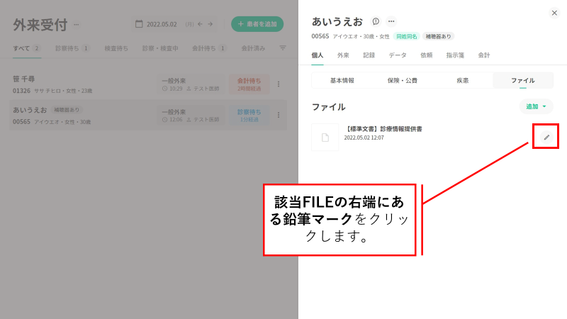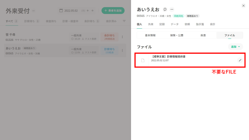 「ファイル」タブでは、患者の保険証や同意書といった書類のスキャンをはじめとする画像ファイルを管理したり、紹介状や診断書を作成することができます。