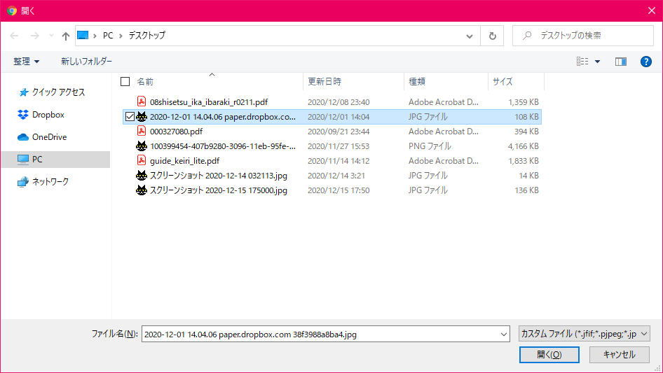 ダイアログにはアップロード可能なファイルにしぼって表示されるので、ファイルを選んで「開く」をクリックしてください。