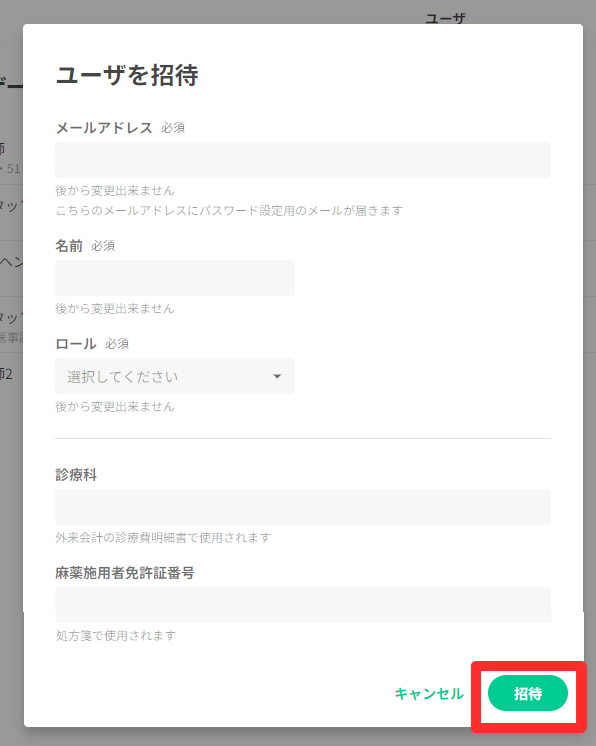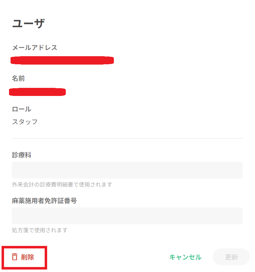 医師・スタッフのロールを誤って登録した場合は、既存のアカウントを一度削除し、正しいロールで再登録してください。同一人物の場合は、同じメールアドレスで再登録が可能です。