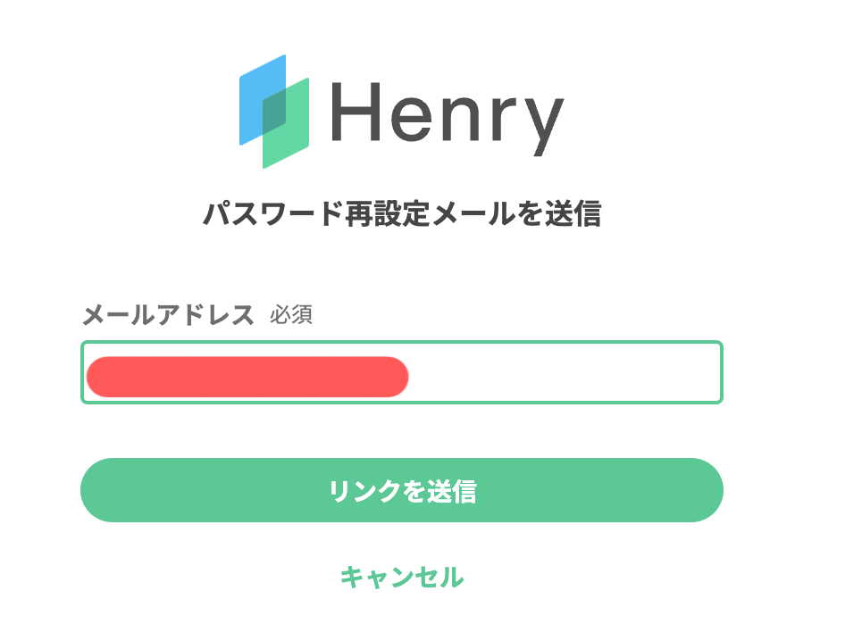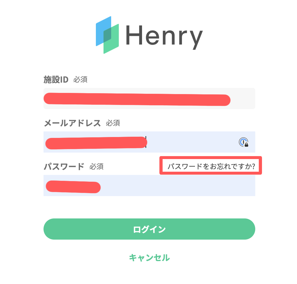 Henryのログイン画面で 施設ID メールアドレス を入力の上、「パスワードをお忘れですか?」をクリックし再度リンクを送信します。