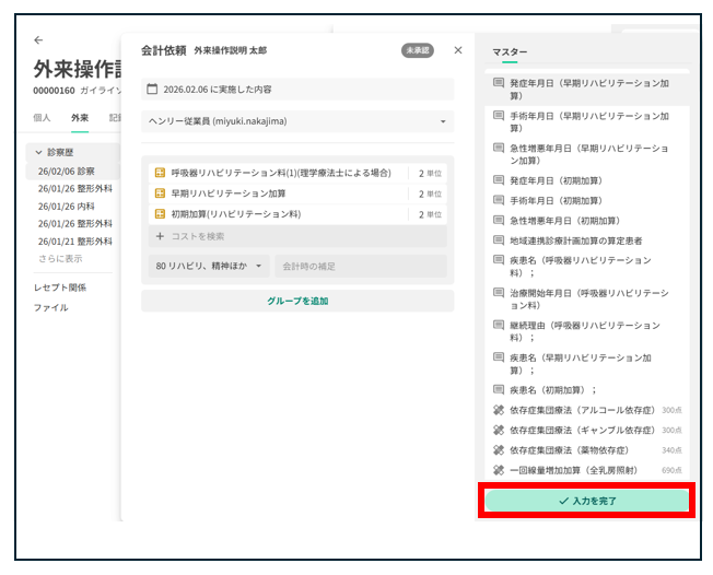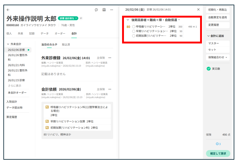 リハビリ料および各種加算が自動判定されます