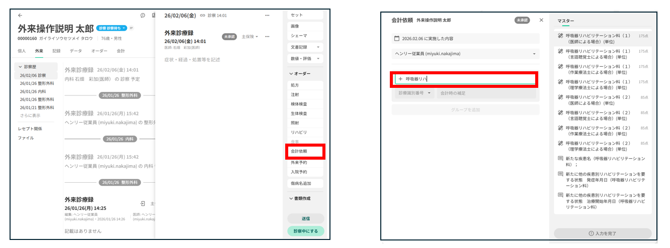 外来の場合 リハビリオーダー登録 → 会計依頼からリハビリコストを入力 → 外来会計に取込まれます