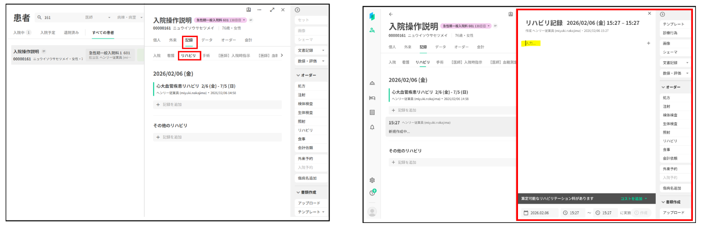 画面右側にリハビリ記録の画面が表示されます