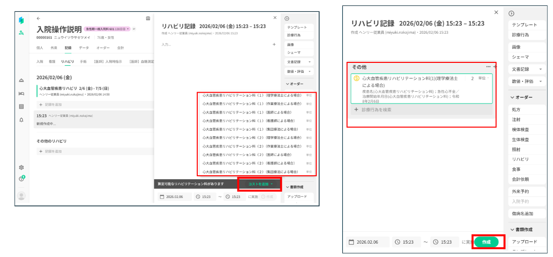 ※リハビリ記録からコストを入力します