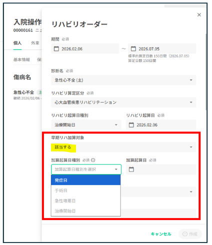 「早期リハ加算対象」欄で「該当する」を選択すると、加算起算日種別・加算起算日欄が表示されます