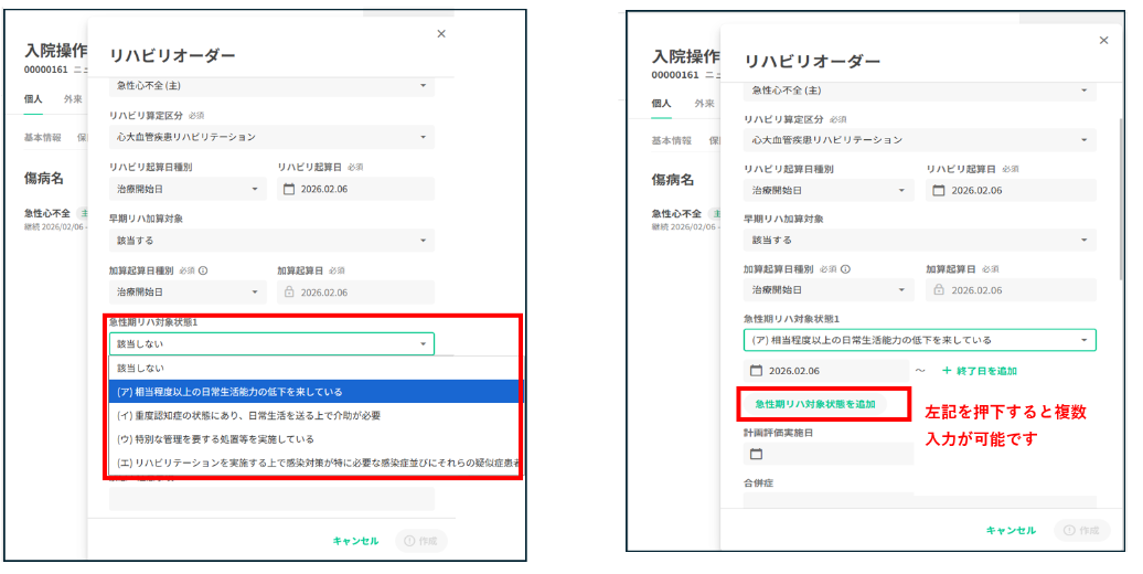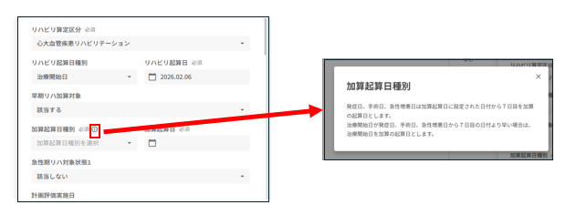 加算起算日種別(治療開始日・発症日・急性憎悪日 等)は、選択した疾患別リハビリテーションの種類によって表示内容が変わります