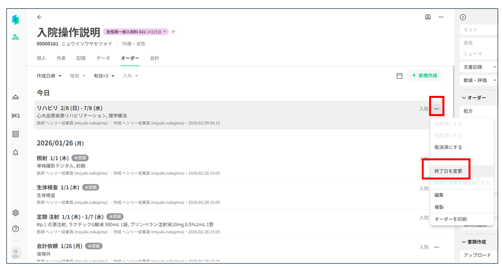 終了日変更はいずれも医師のみが操作可能です。
