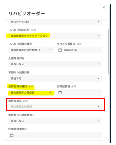 「廃用症候群リハビリテーション」で早期リハビリテーション加算の対象となる場合,加算起算日種別を選択すると、急性期疾患名の入力欄が表示されます
