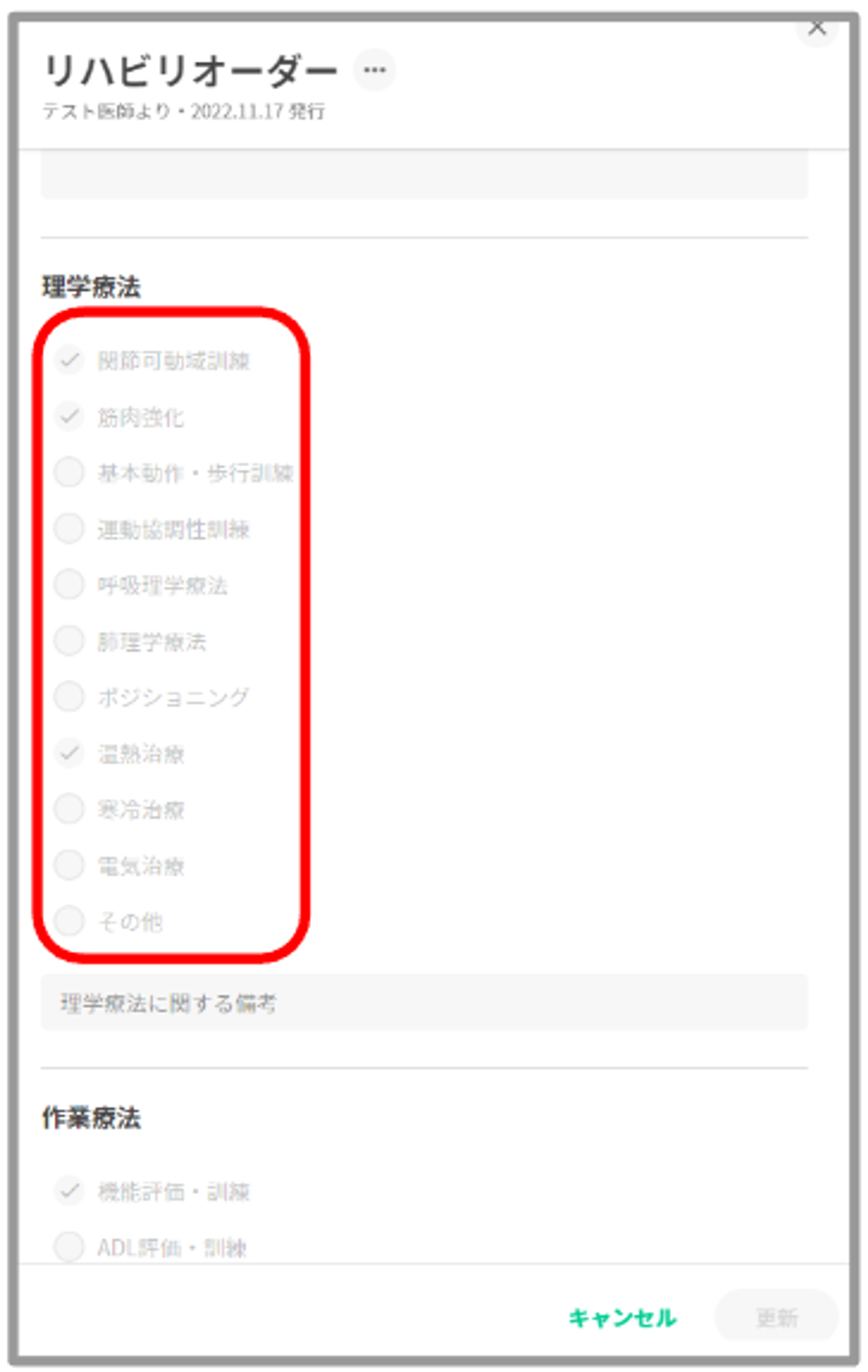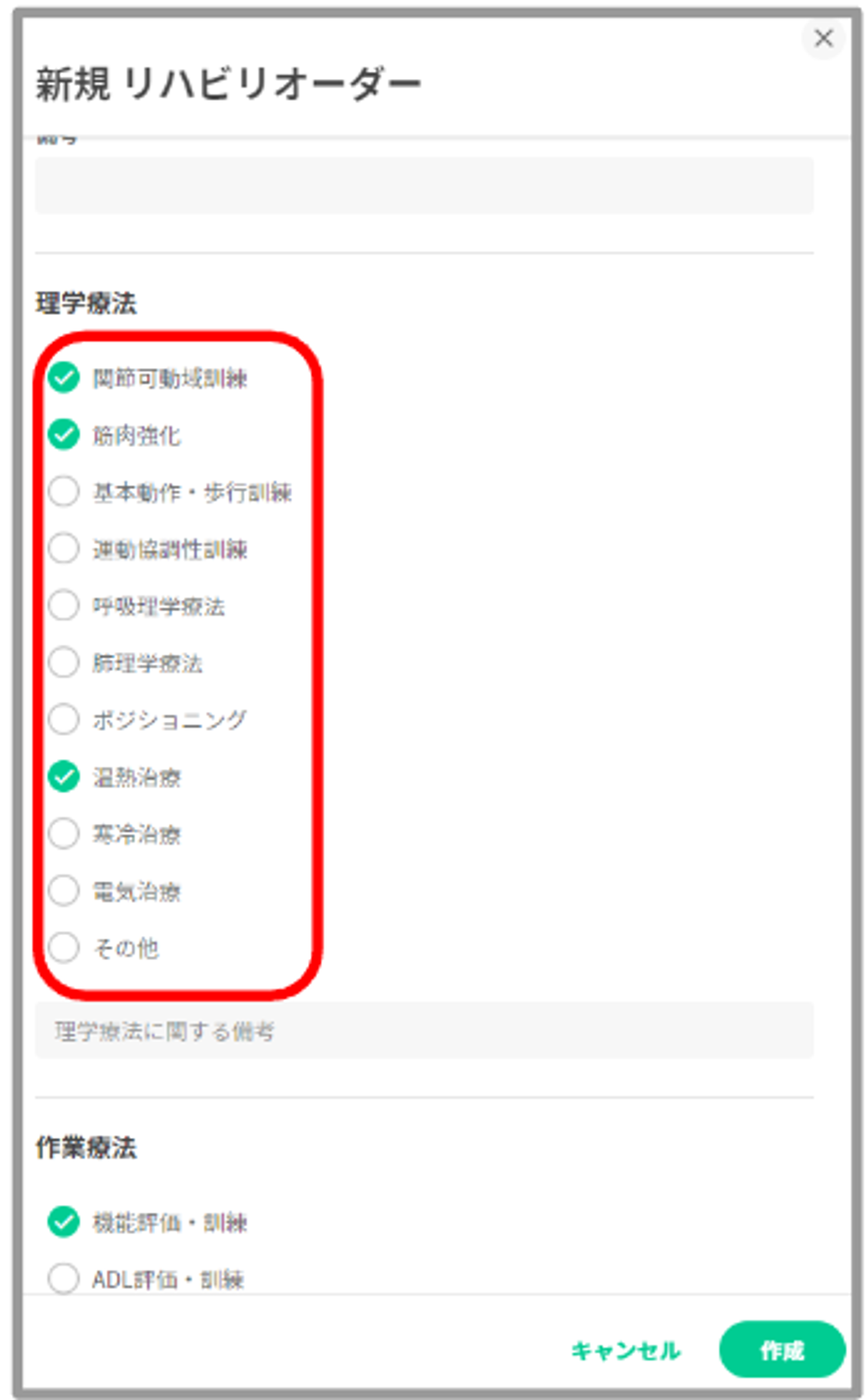 理学療法・作業療法・言語聴覚療法を入力する際に✅形式で入力できます。