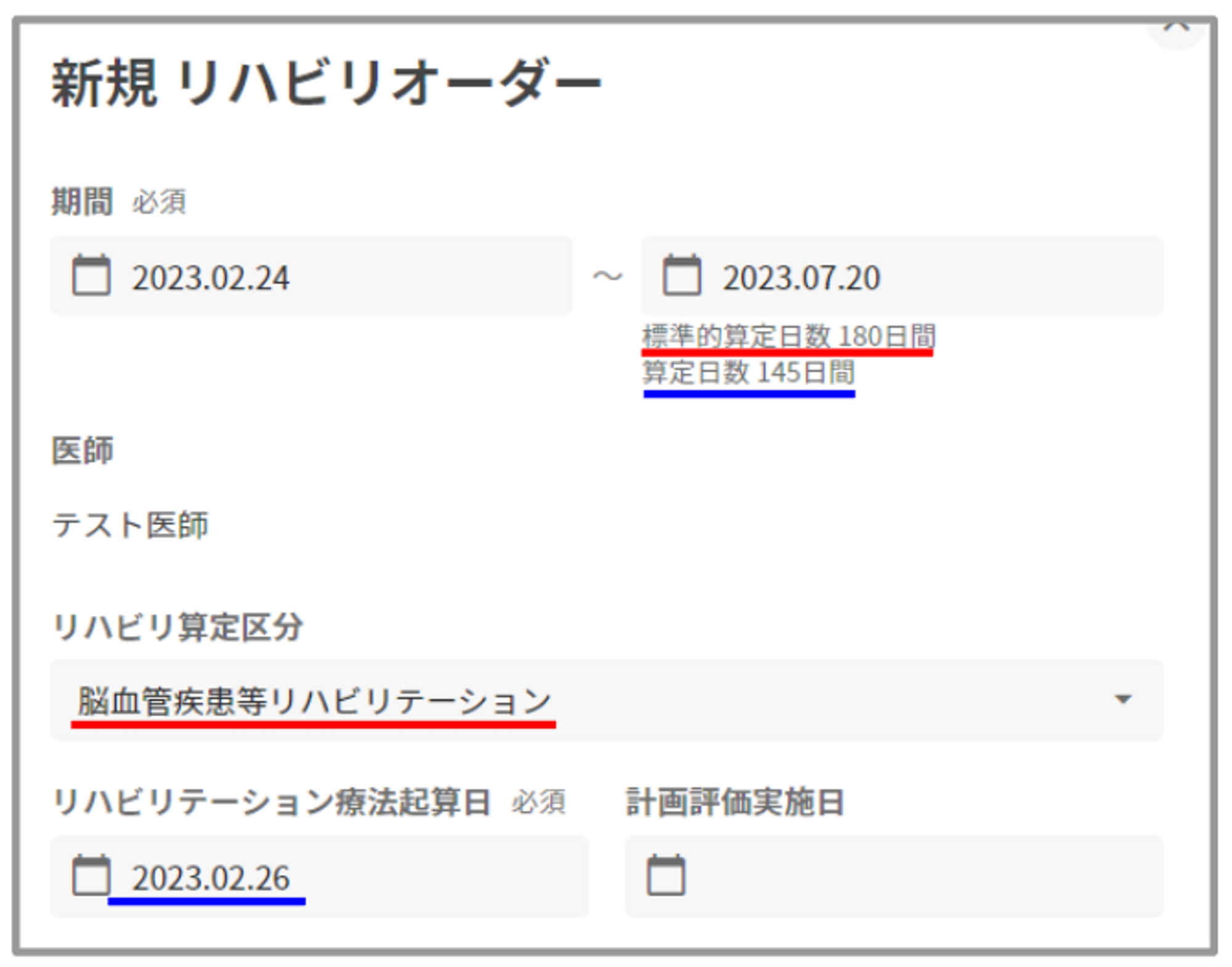 さらに、終了日欄下部には「リハビリ算定区分に基づいた標準的算定日数」と「リハビリテーション療法起算日からの算定日数」が表示されます。
