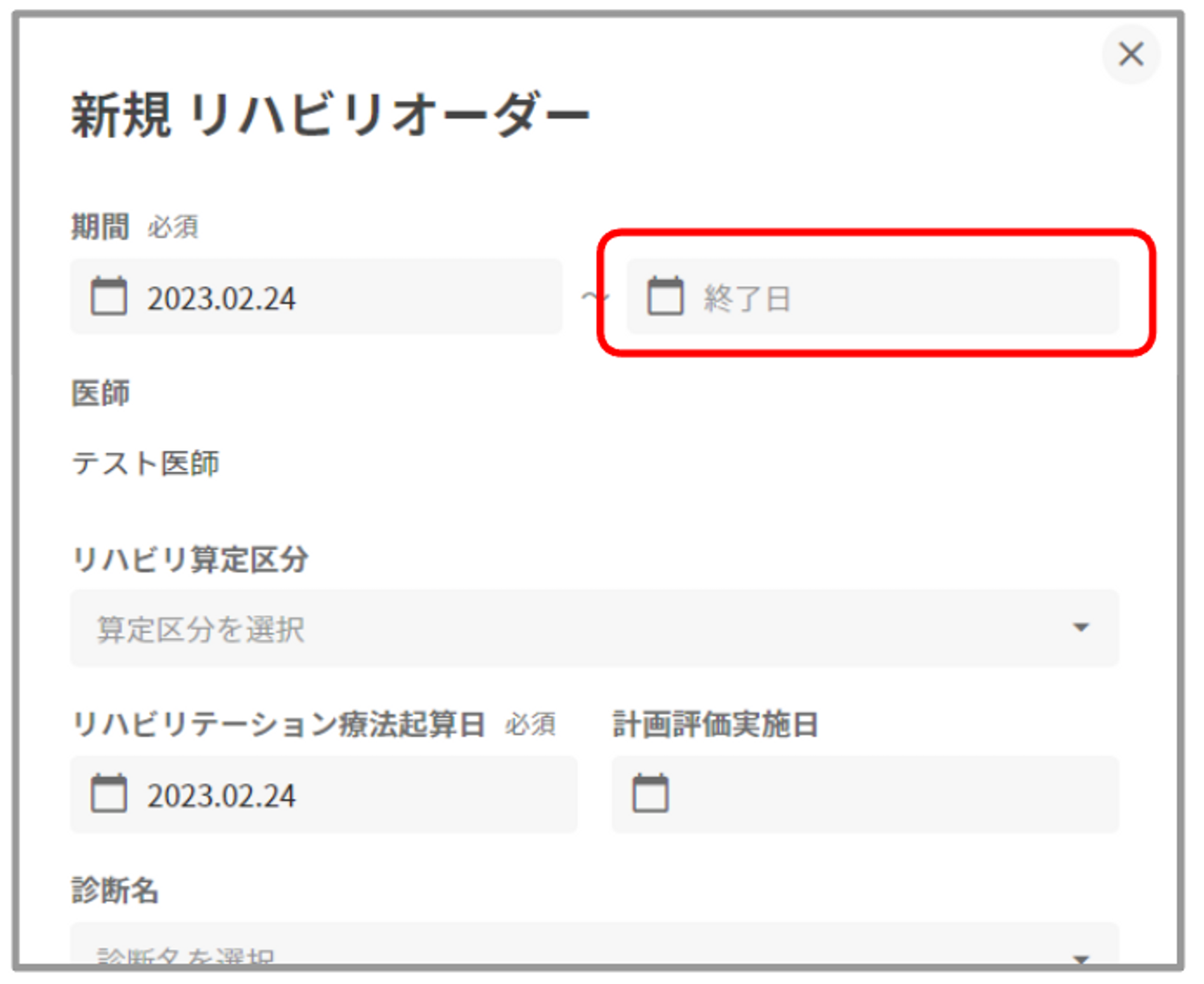 リハビリオーダー作成時に、終了日の設定を行えます。