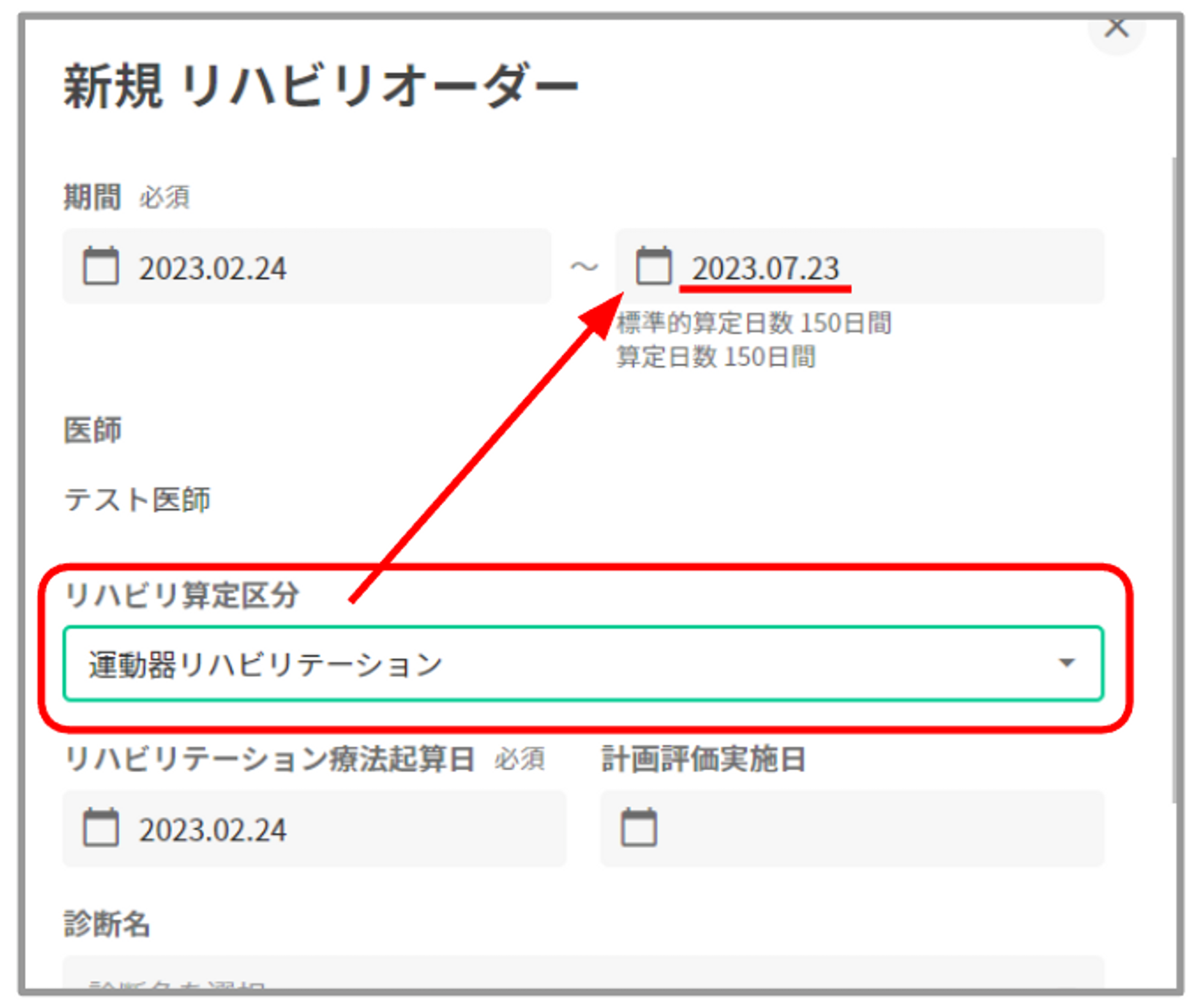 リハビリ算定区分を選択すると、「標準算定日数に基づいた終了日」が自動で設定されます。