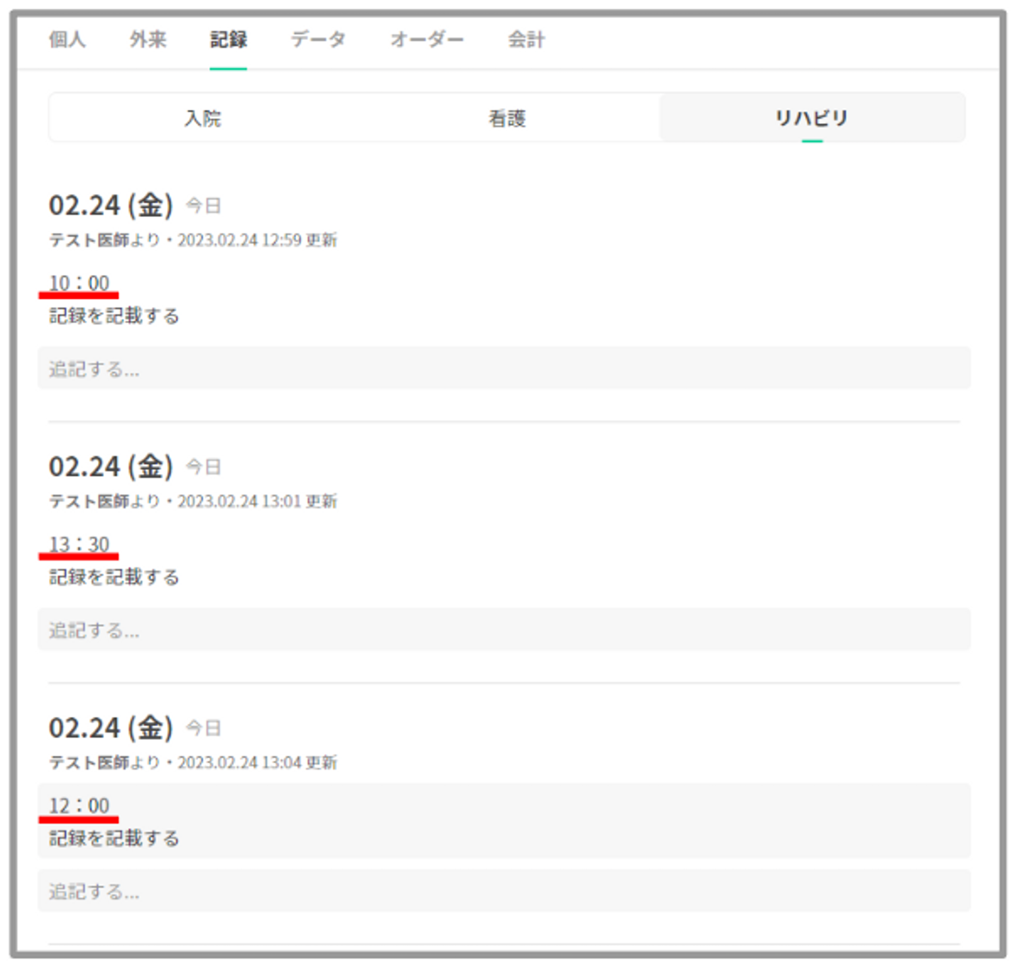 記録は追加した順に記録され、並べ替えを行うことはできません。そのため、「作成時刻」と「記録の時刻」が異なる場合は、記録最上位に記録の時刻を記載するなどの運用をお願いいたします。