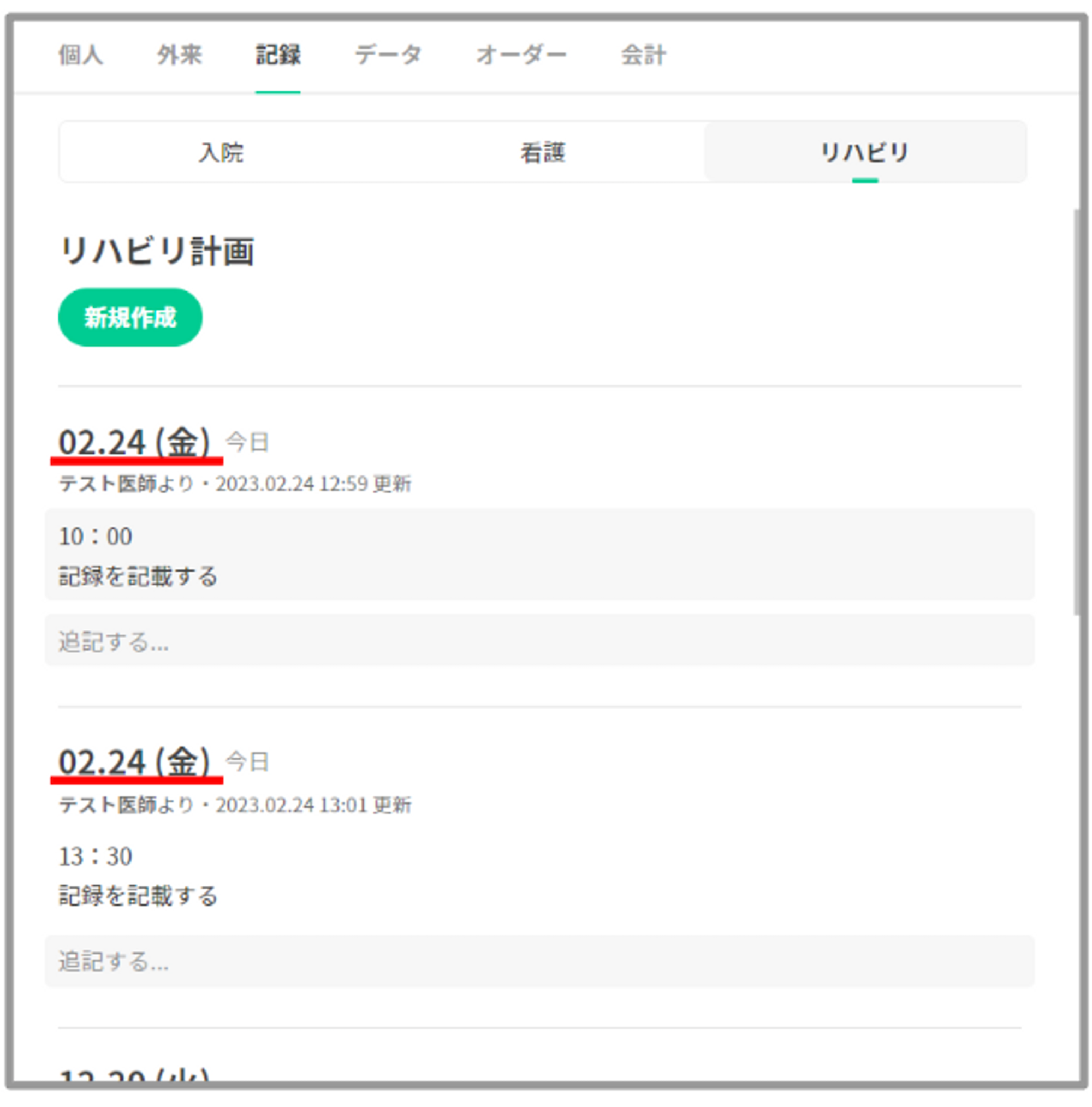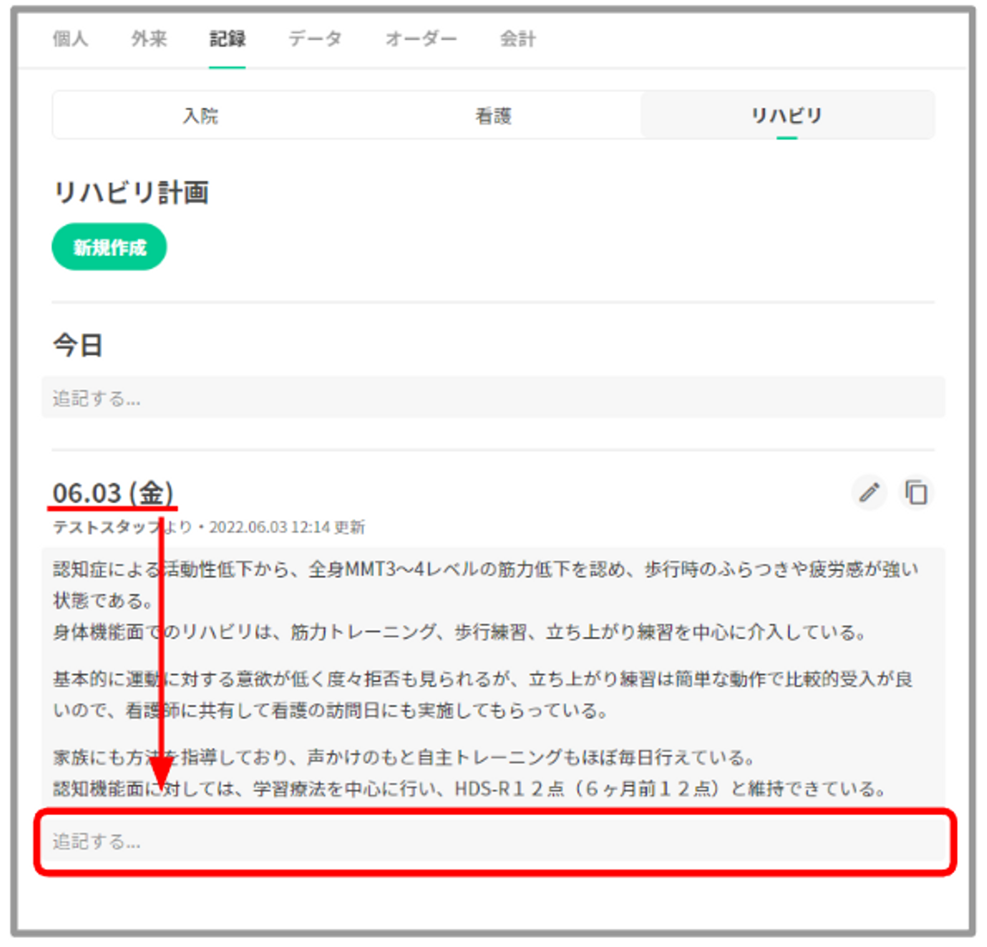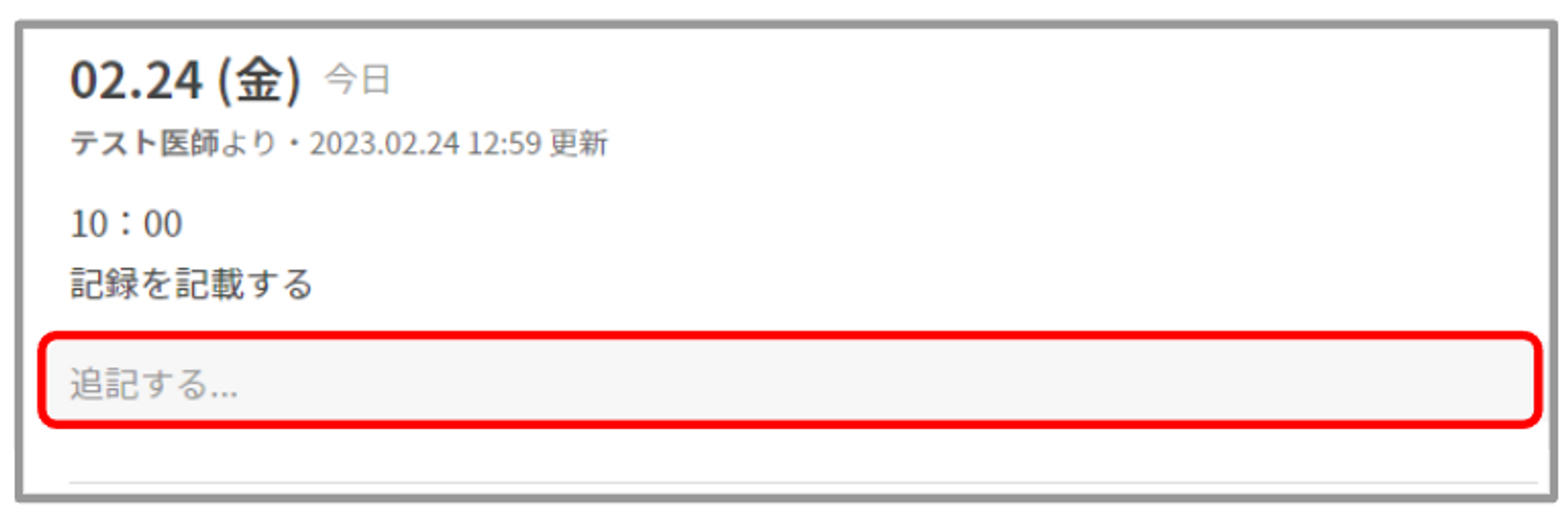 同一日に新たな記録を追加したい場合は、追加したい日の記録下部に表示される「追記する…」より作成を行ってください。