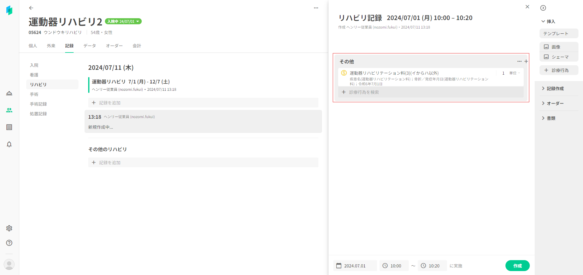 「運動器リハビリテーション」のリハビリオーダーに紐づいたリハビリ記録を作成するとき、リハビリ記録に運動器リハビリテーション料(Ⅱ)をサジェストします。