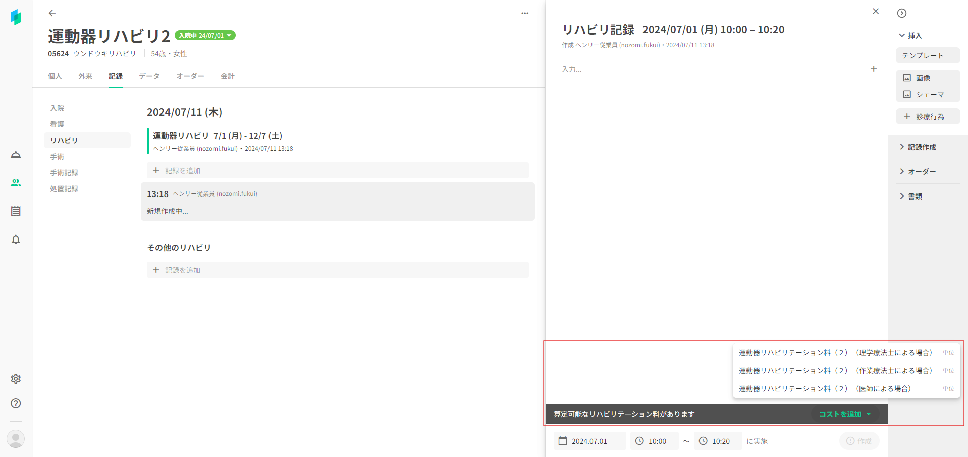 オーダーに紐づいたリハビリ記録を作成するとき、施設基準の届出を行っているリハビリテーション料しかサジェストされないため、手動でコストを変更する必要があります。